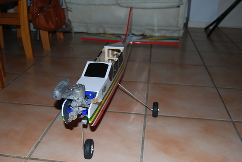 Detrás, en la parte final del fuselaje, puse una pieza de plástico como patín de cola, pues se rozaba en algún despegue.