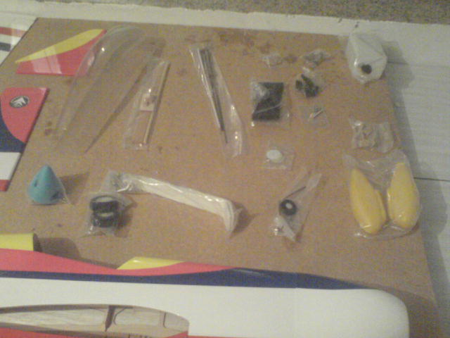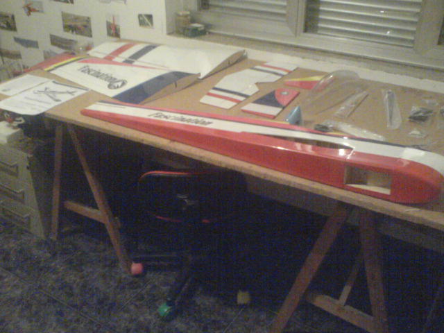 Hola! en primer lugar dar las gracias a Juan de aeromodelismodag por confiar en mi y por su patrocionio. Pues acabo de recoger este magnifico avion para empezar y perfeccionar nuestras tablas de f3a, por lo que he visto hasta el momento viene cuidado al detalle. Las alas construccion clasica de costillas con dos servos, fuselaje de madera de contrachapado aligerado al maximo enchapado con balsa y recubrimiento de oracover. Los accesorios vienen en bolsas separados según su fincion (horns por un lado, bisagras por otro, bancada por otro, tren por otro...) El avión en si es una pasada y la decoracion es muy llamativa. Y como una imagen vale mas que mil palabras......