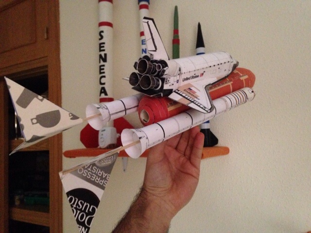 Te dejo un vídeo de la de nuestro compañero Piero, también construida en papel (en el apogeo se separan los boosters del transbordador, y este planea en círculos hasta aterrizar, todo un espectáculo)