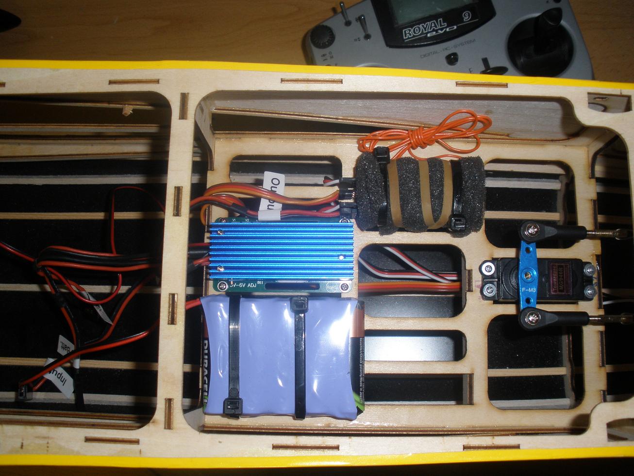 Exacto, van dos lipos cada una con su regulador independiente, uno para en encendido y otra para el receptor (la del receptor con un regulador de 15A para no quedarse corto ante el mayor consumo de los servos). En el regulador de 15A no uso las dos salidas que tiene, solo una de ellas. Podria alimentar perfectamente el encendido, pero he preferido poner otra bateria con otro regulador