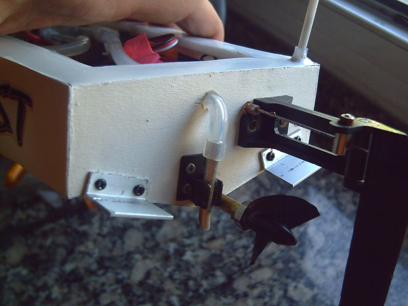 Pues dicho y hecho, los trim-trabs, hechos con un retal de aluminio en "L", han costado hacerlos, porque son muy chicos, para que estén en consonancia con la escala de la lancha, van atornillados al espejo de popa, al rás de la parte de abajo del casco, con unos tornillitos que dan risa de verlos, queda superfuerte. La regulación será manual y con los alicates que te crió JE JE, después de esto vendrán unos turn-fins.
