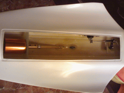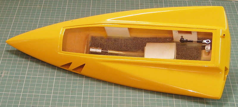 bandeja a media altura encima del eje. El extremo posterior, extremadamente afinado, soporta el eje recto de 2mm con la incidencia adecuada, descentrado hacia la derecha para compensar el par motor (1/4 del diámetro de la hélice), así como el soporte del timón y la varilla de mando: ésta es la pieza más delicada de hacer.