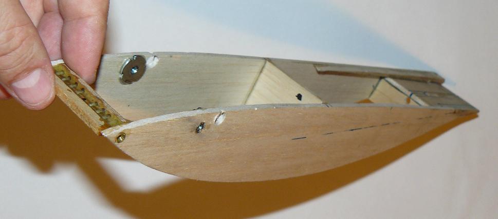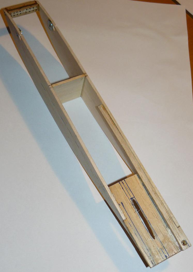 Los costados y cuadernas son de balsa media de 3mm, y las superficies de contrachapado finlandés de 0,6mm. Las dimensiones del cajón-fuselaje son finalmente de 35cm de largo, por 4,6cm de ancho, por 4cm de alto.