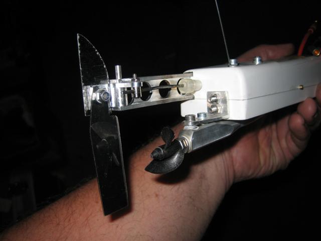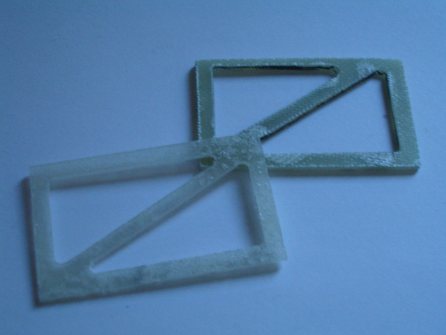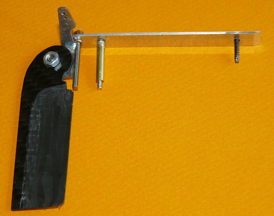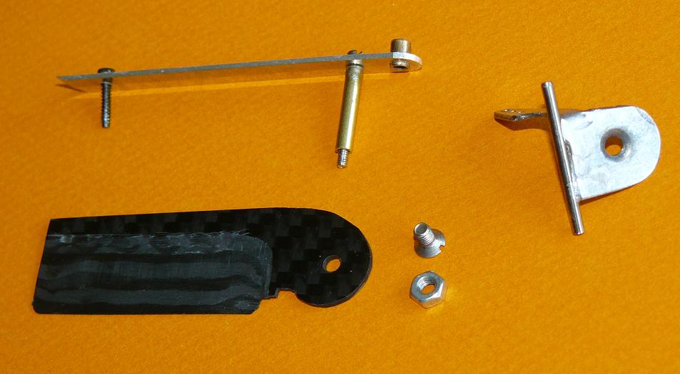 De estas dos piezas, la inferior mide sólo 18mm de largo y está embutida en el extremo de la cuña de madera de balsa; tiene un taladro y tuerca M2 igualmente embutida, para recibir el tornillo que une las dos piezas de dural (en ambas, a 8mm del eje de giro).