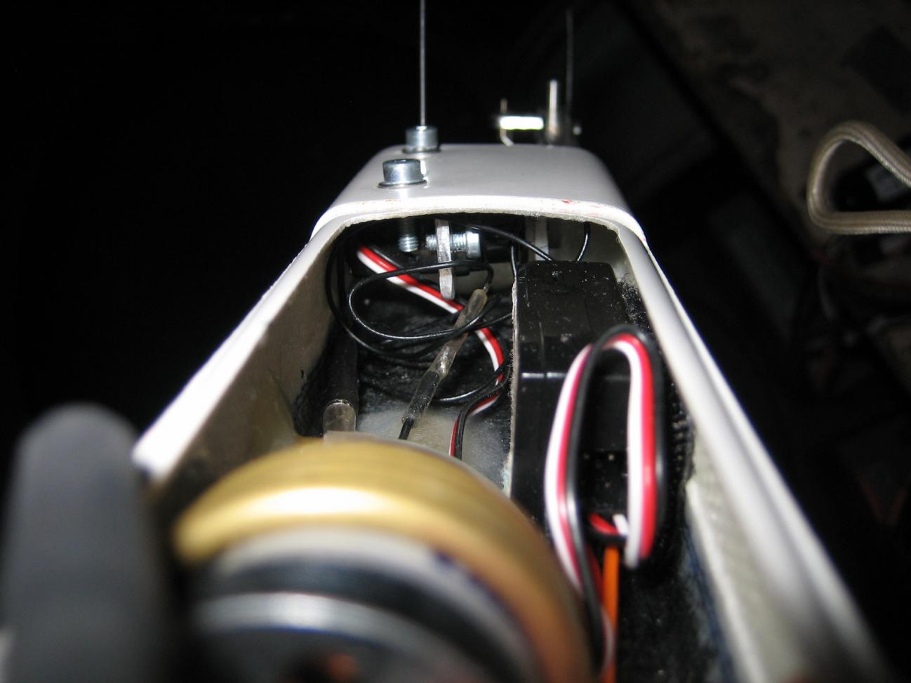 Un sencillo tubo de bronce de 3mm de diámetro exterior y 15mm de largo separa las dos piezas de dural, y las une un tornillo M2 que pasa a través del tubo hasta la tuerca embutida en la cuña de balsa de la parte inferior del casco.