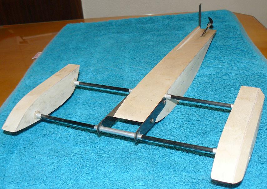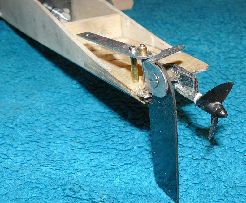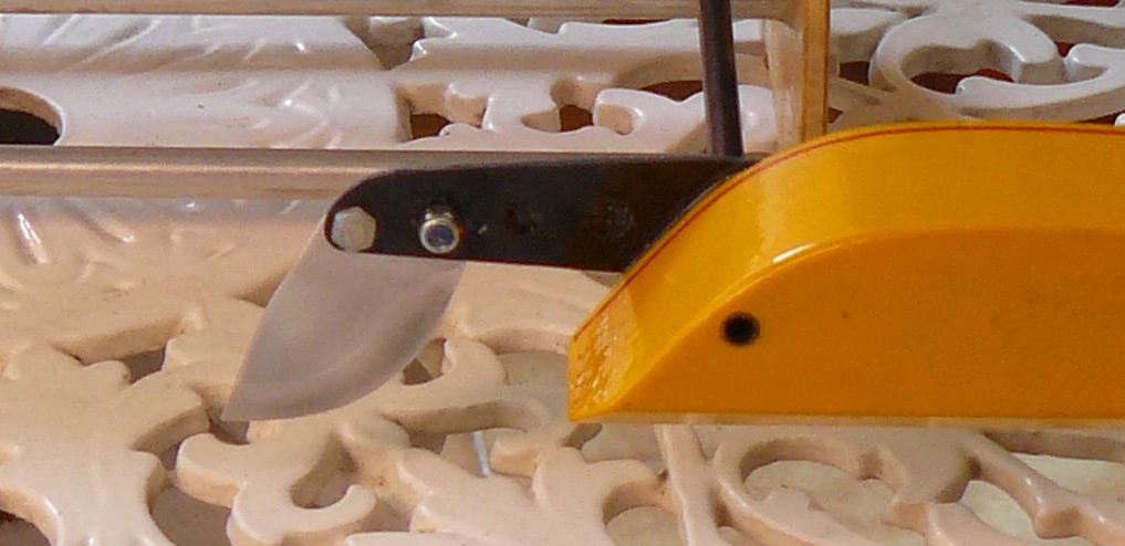 La pala del turn-fin está cortada de duraluminio de 1mm, biselado convenientemente y doblado unos 15º hacia adentro según una línea paralela a la línea de planeo; es importante comprobar con una regla que es paralelo al eje longitudinal del hydro. Como veis va unido con un tornillo M3 con tuerca autoblocante y un tornillo de nylon M3 para que se rompa en caso de impacto.