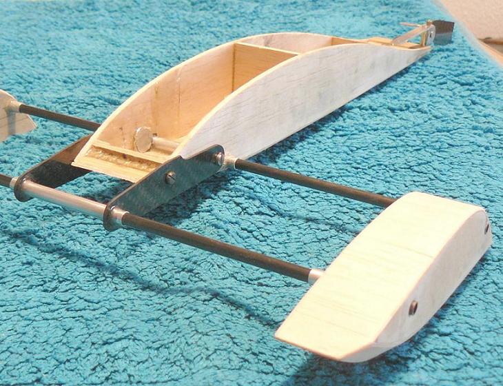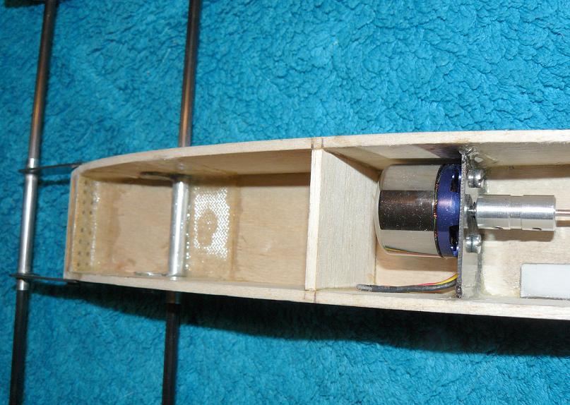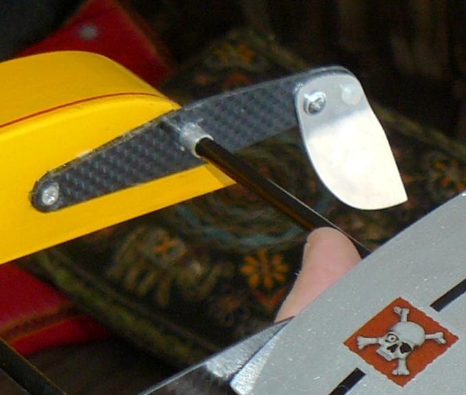 varilla de mando ha de estar en el punto intermedio de las posiciones durante su recorrido; la salida es un punto débil sometido a movimientos pequeños pero constantes, así que lo he reforzado con unos pedacitos de seda y epoxi (uno por debajo del tubo y otro por encima). Aunque ya hemos hablado de ello, insisto en que uno de los refuerzos principales es el trozo de fibra de vidrio que envuelve el extremo de la bocina con la pieza de carbono de 2mm, pues toda la fuerza y vibraciones de la hélice es aquí donde actúan.