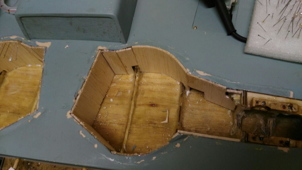 He cambiado las fijaciones del tren, ahora van con arañas de 3mm, he quitado los cajones de plastico, he cerrado con balsa, enfibrado y despues me fui al leroy merlin con un trozo de entelado y con la maquinita esa que tienen me hicieron un bote del mismo color (un pelin mas claro).