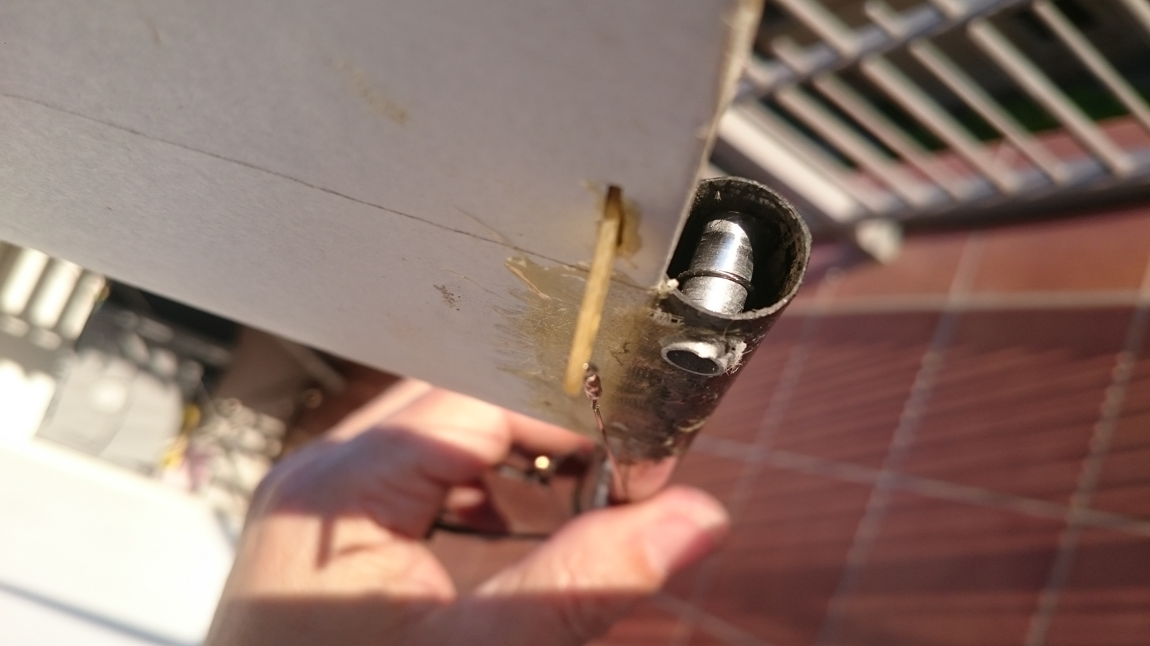 Para retirar la resina de la bisagra uso un disco de corte de metal apoyado en una regla. Con pasadas suaves se corta la fibra y se va retirando poco a poco la resina, con cuidado de no cortar la bisagra. El disco lo paso A MANO y por los dos lados de la bisagra.