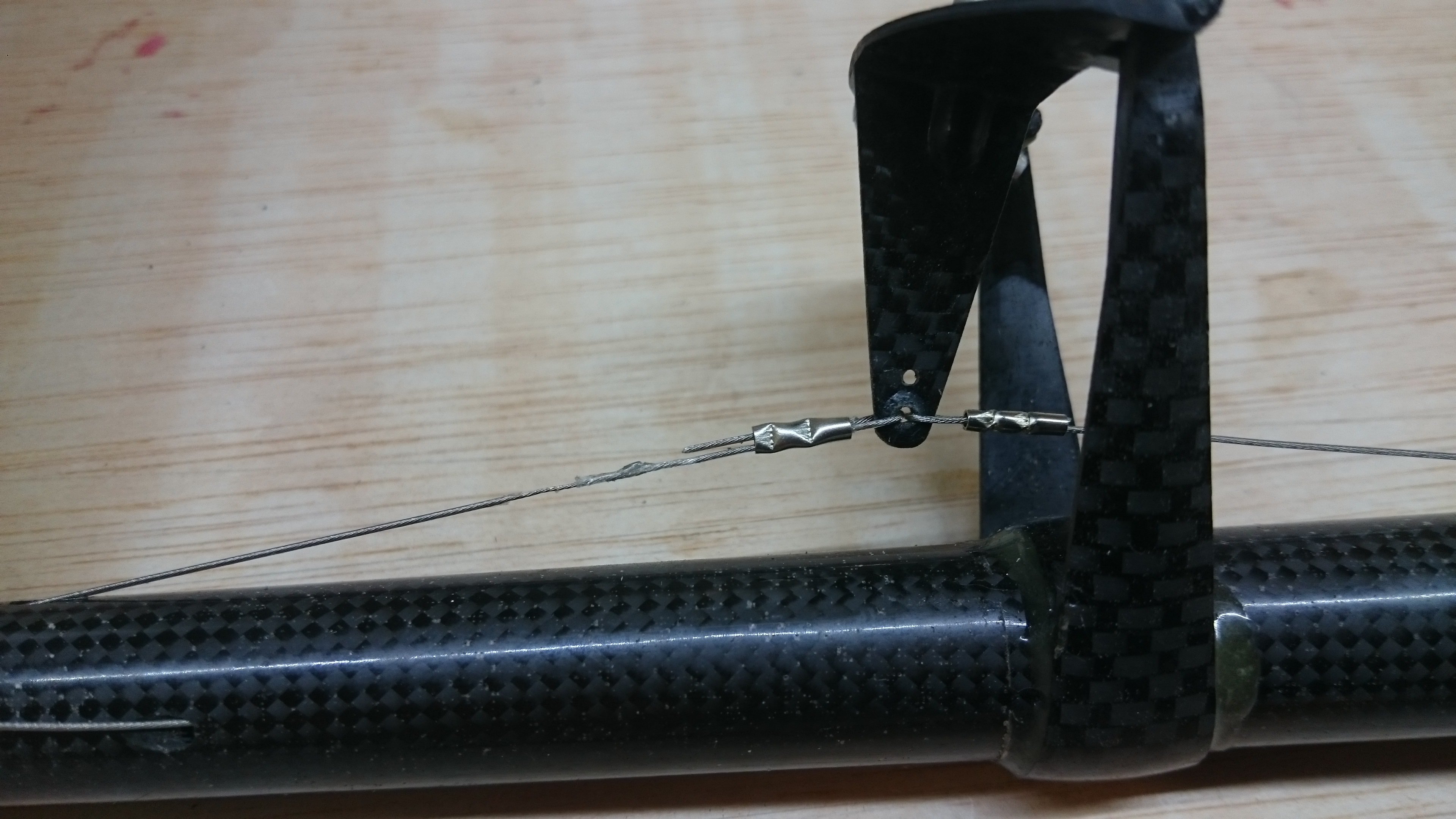 Aunque apenas he usado sistemas de mando de doble cable, y sólo en aviones índoor, me atrevo a hacer una observación. Tal como lo entiendo al moverse el servo recoge cable de un lado y suelta del otro, hasta ahí todo correcto. Si los brazos son iguales lo hace además en la misma cantidad. Pero los anclajes en el actuador del elevador parecen a distancias distintas del eje (mayor en el cable que tira para subir). Interpreto que de esta manera, al girar el servo "a subir" el cable "de bajar" se afloja al ceder más de lo que "le pide" la escuadra de mando. Sin embargo cuando el servo gira "a bajar" lo hace tirando del cable anclado encima y soltando el de abajo, que viene del reenvio, pero en la misma cantidad ambos, cuando la escuadra "le pide" más desplazamiento. El resultado sería una tensión indeseada que incluso podría según su magnitud impedir el movimiento.