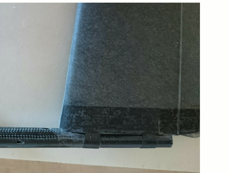 Hago unos cortes, sin llegar al final, justo en los límites de la cinta bisagra. Después engancho una tira de fibra 50gr a lo largo de los cortes vigilando que sobresalga un poco por el extrados y el intrados para unirlo con la piel del ala. Toda esta zona la impregno de resina al mismo tiempo que la bisagra justo antes de colocar la piel de carbono con el Mylar. Por el interior la resina ya entra por capilaridad.