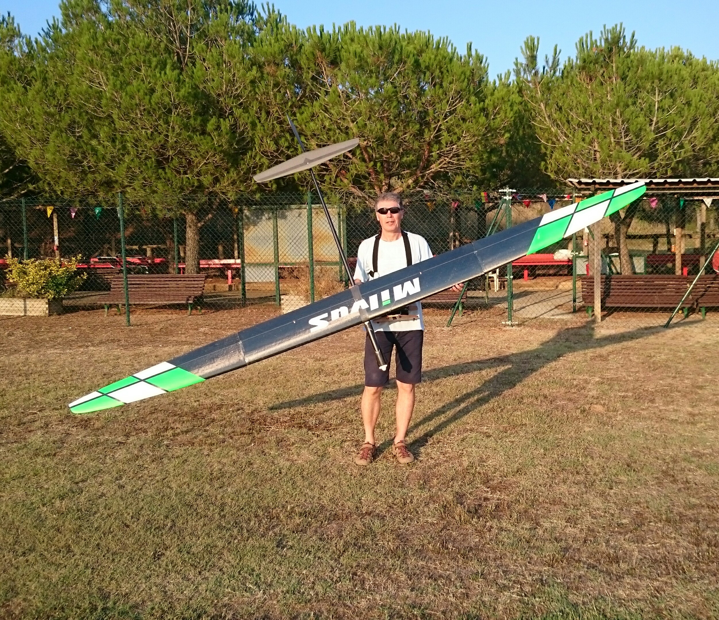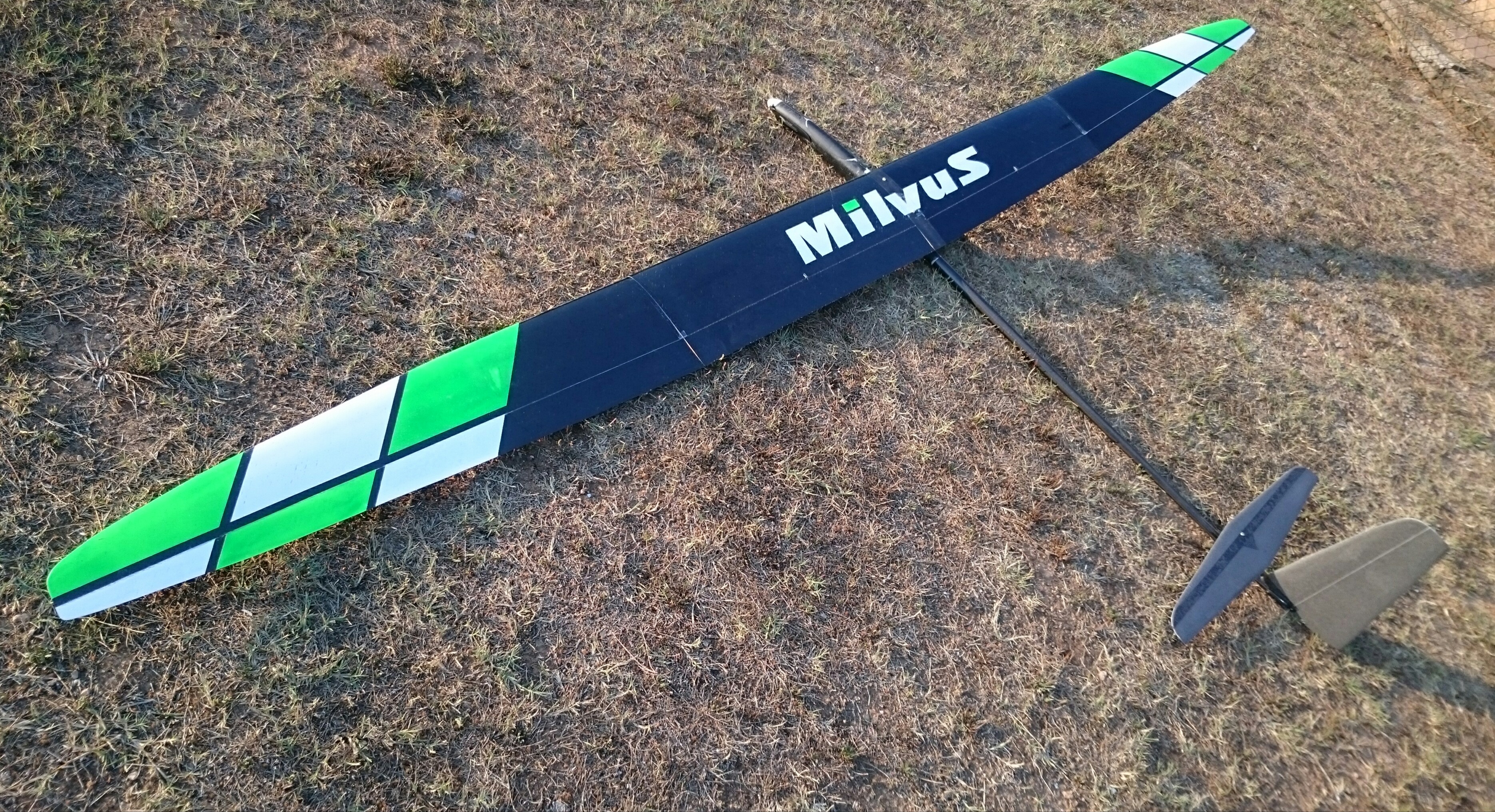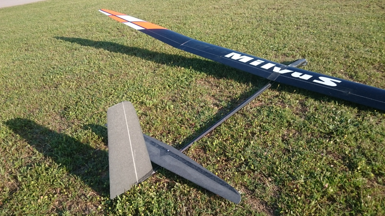Con un peso final de 1.150 gr, el Milvus en su versión más ligera no tiene mucha rigidez de alas. En el Fly off pillamos unes ascendecias muy fuertes y como hay que volar 15 minutos subimos bastante arriba. En mi caso en el segundo vuelo llegé a los 500 metros y a esa altura casi no veia el modelo. Para la bajada puse flaps a tope y fui picando el modelo, pero en un momento se aceleró bastante y las alas cogieron un diedro negativo bastante pronunciado. Al llegar al suelo vi que una funda de la bayoneta habia cogido holgura por lo que el último vuelo lo hice con el Supra.