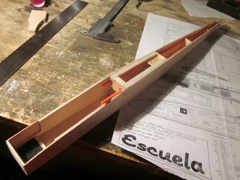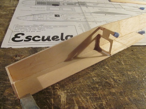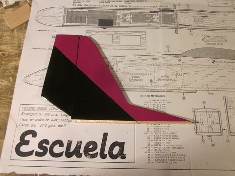 ), y basicamente me enseño una montaña de recortes de balsa, diciendome "haz el avion que te da la gana!!"... Pues eso, asi que me he puesto manos a la obra con un Escuela de Modelhob, pero con una "ligera" diferencia: esta al 50% del original, dando una envergadura total de solo 1 metro. Tambien he hecho alguna personalizaciones mias ya que soy alguien que no puede dejar de pensar cosas, de experimentar y todo eso... Principalmente lo que he hecho es hacer las alas de una pieza en el centro, y con los diedros externos plegables para facilitar su transporte... seguramente pensaran que estoy loca, pero son las locuras las que descubrieron America, las que pusieron un hombre en la luna, y otras locuras asi!!