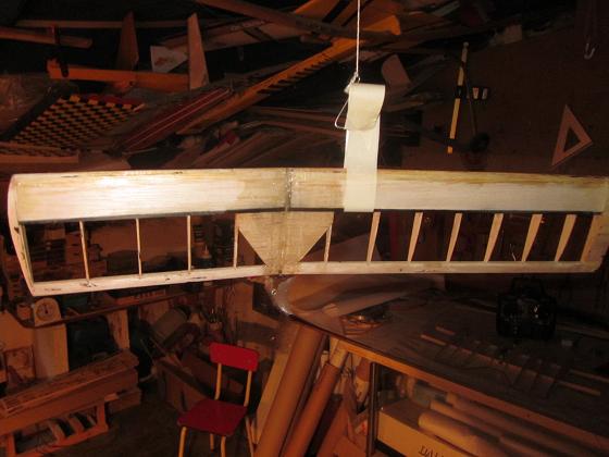 Cuando las dos semialas estan terminadas, podre unirlas en el centro, replantear el anclaje con el fuselaje, enfibrar el centro y entelar todo... para la semana que viene me parece que estara. Y eso que tengo "toque de queda", que tengo que terminarlo antes del jueves 13 :cry: