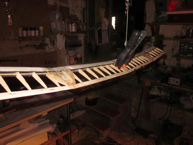 Ya despues de esto, queda encontrar una buena manera de anclar el borde de ataque al fuselaje, poner fibra para reforzar en el centro, entelar, y ya esta!! :mrgreen: :mrgreen: