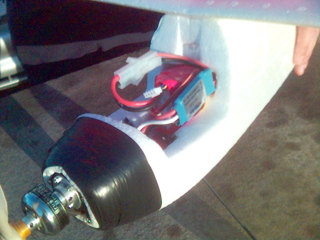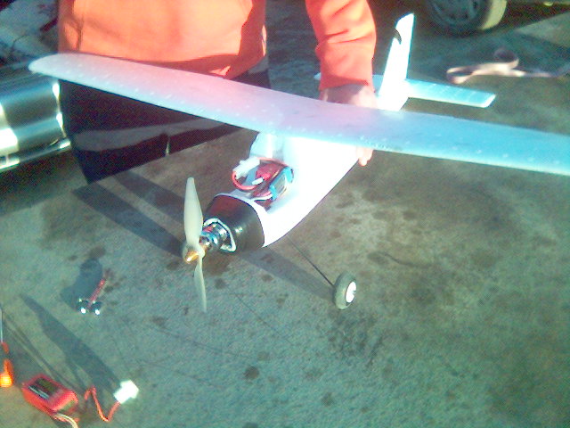 Y ahora el fin de la prueba: se ve que de tanto tantos por ciento y de tanto prueba que te prueba se le fue la pinza al servo de profundidad asi que haciendo el gamba a unos 15 m de altura se jodio el servo quedandose la profundidad arriba del todo y la minimag encabritandose continuamente. Resultado: alas partidas por la mitad y el morro como un acordeon...