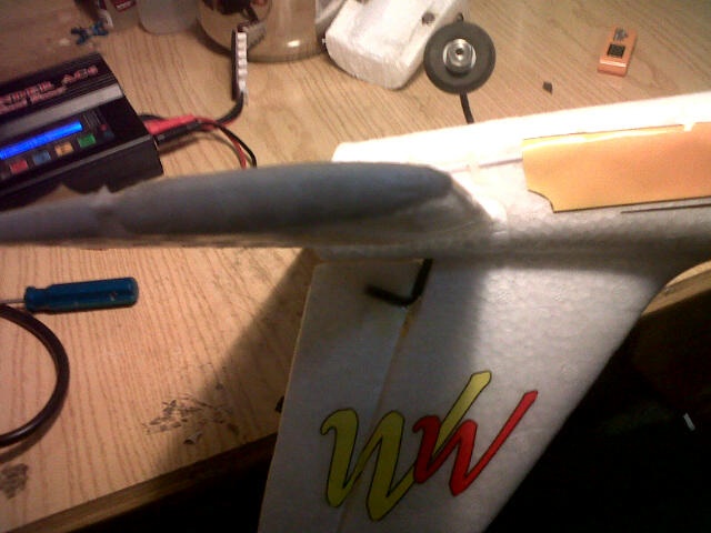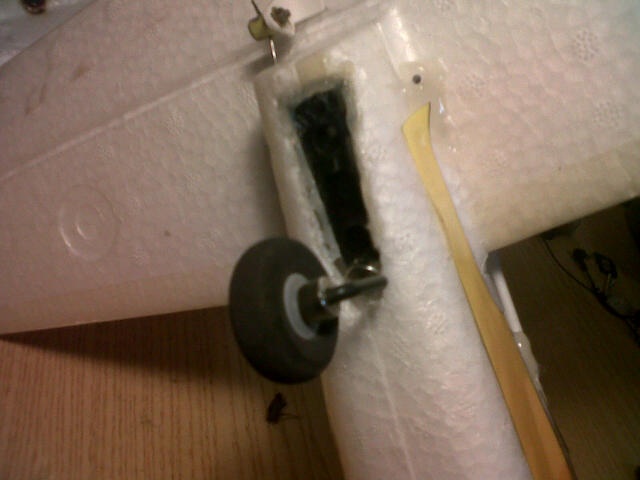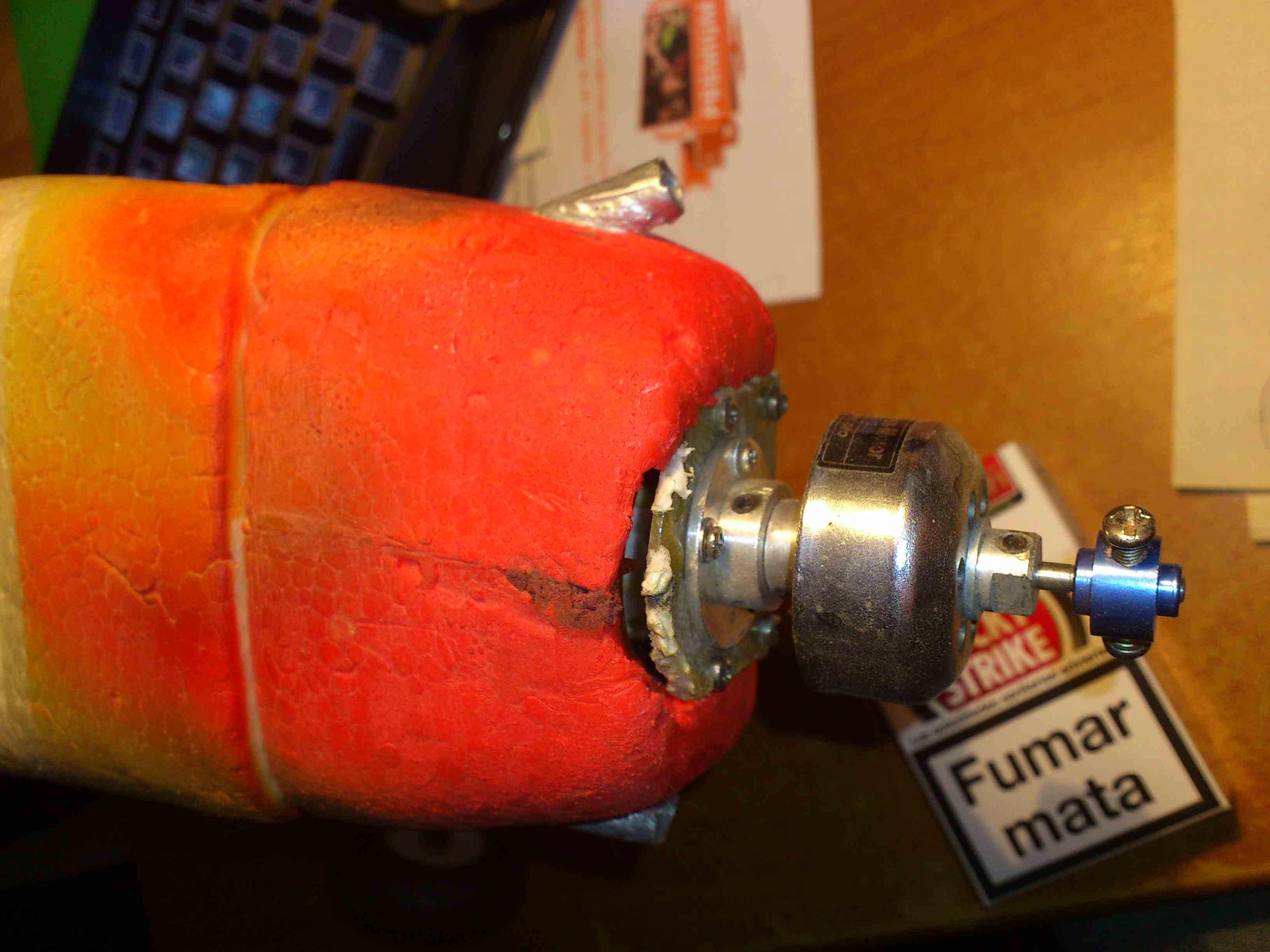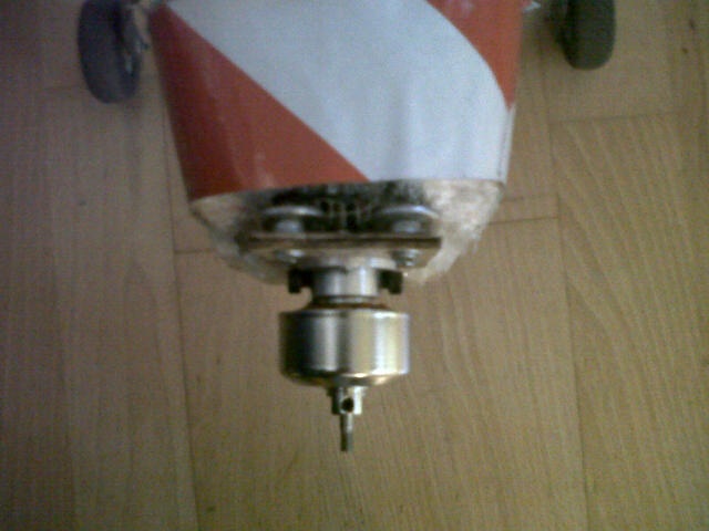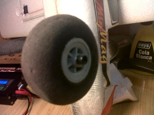 El motor que traía de serie, lo sustituí después del primer vuelo, ya que no tiraba como yo esperaba, de modo le compré un brushless turnigy c826-1350 y con él he tirado durante mucho tiempo. Como bien se dice por aquí, el principal inconveniente fue la bancada. Como tenía la original en buen estado, limé con la dremel el interior para que el motor rodase sin obstáculos y corté a medida un trozo de madera al que atornillé el motor, dejando que sólo sobresaliera el eje. Luego con tres pequeños taladros (la bancada ya había perdido uno de los espacios para atornillar) atornillé la madera a la bancada, previo fijado con silicona caliente. Así voló mi minimag durante un tiempo después, con buenos rendimientos, aunque muchas veces tuve que reparar distintos elementos del miminag tras cada caída. La última caída la tuve hace un par de semanas. La mandé al suelo en picado y rompí un poco el morro, pero tras algunos arreglos, otra vez estaba lista para el vuelo. Sin embargo, cuando me dispuse a tirarla, observé que el motor rugía de modo inapropiado y que el eje no estaba derecho, así es que decidí cambiar el motor.