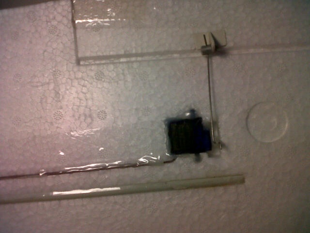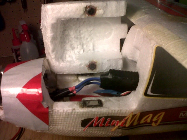 , y probé a instalarlo. Este motor va fuera del casco, de modo que lo primero que hice fue adaptar un trozo de plástico de una cajita que tenía por ahí (ahora guardo ese tipo de cosas, por si sirven para un futuro). Usando la misma bancada original (aunque está pegada y repegada al fuselaje), le hice a la pieza de plástico los tres taladros indicados antes para poder atornillarla finalmente a la bancada y otros tres taladros para atornillar el motor a la pieza de plástico. El inconveniente que tuve es que los tornillos que vienen con el motor bm2409-13, al contrario de lo que sucedía con el motor turnigy, no enroscan en la base, así es que con mucho tiento y paciencia les coloqué una arandela (para sujetar mejor) y los enrosqué a una tuerca pequeñita (pieza de plástico, base del motor, arandela y tuerca, mirando desde la cola al morro), tornillo, arandelas y tuercas venían con el motor. Para que los cables no quedaran por fuera del fuselaje, le taladré a la pieza de plástico un agujero suficiente para que pasaran los cables y llevarlos por el interior derechos al variador. Finalmente, antes de atornillar la pieza de plástico (con el motor ya atornillado a ella) a la bancada original, limé el morro de la minimag para que ajustara bien y le puse un poco de silicona caliente para reforzar el agarre, el cual quedó perfectamente fijo después de colocar los tornillos a la bancada negra original. Se me olvidó decir que también tuve que cortar el eje del motor, que no se por qué es originalmente tan largo.
