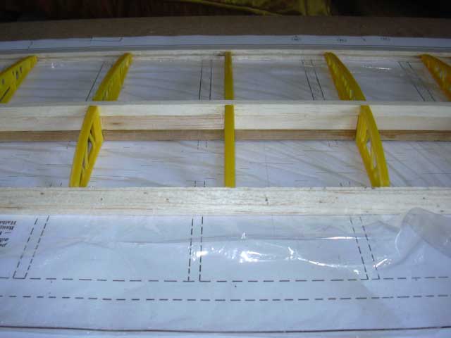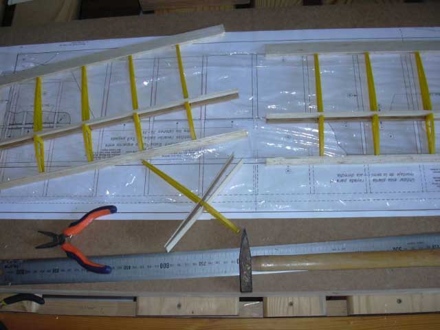 No tengo ninguna tecnica nueva que comentar, los adhesivos utilizados hasta ahora han sido el clasico imedio (que diluido en acetona me permite extenderlo con un pequeño pincel), la cola blanca para las uniones con amplia superficie balsa-contrachapado finlandes y el epoxi en las cuadernas del fuselaje. Como tengo acceso a una fotocopiadora con salida en formato A3, copie el plano y aun asi lo he protegido con film transparente de cocina.