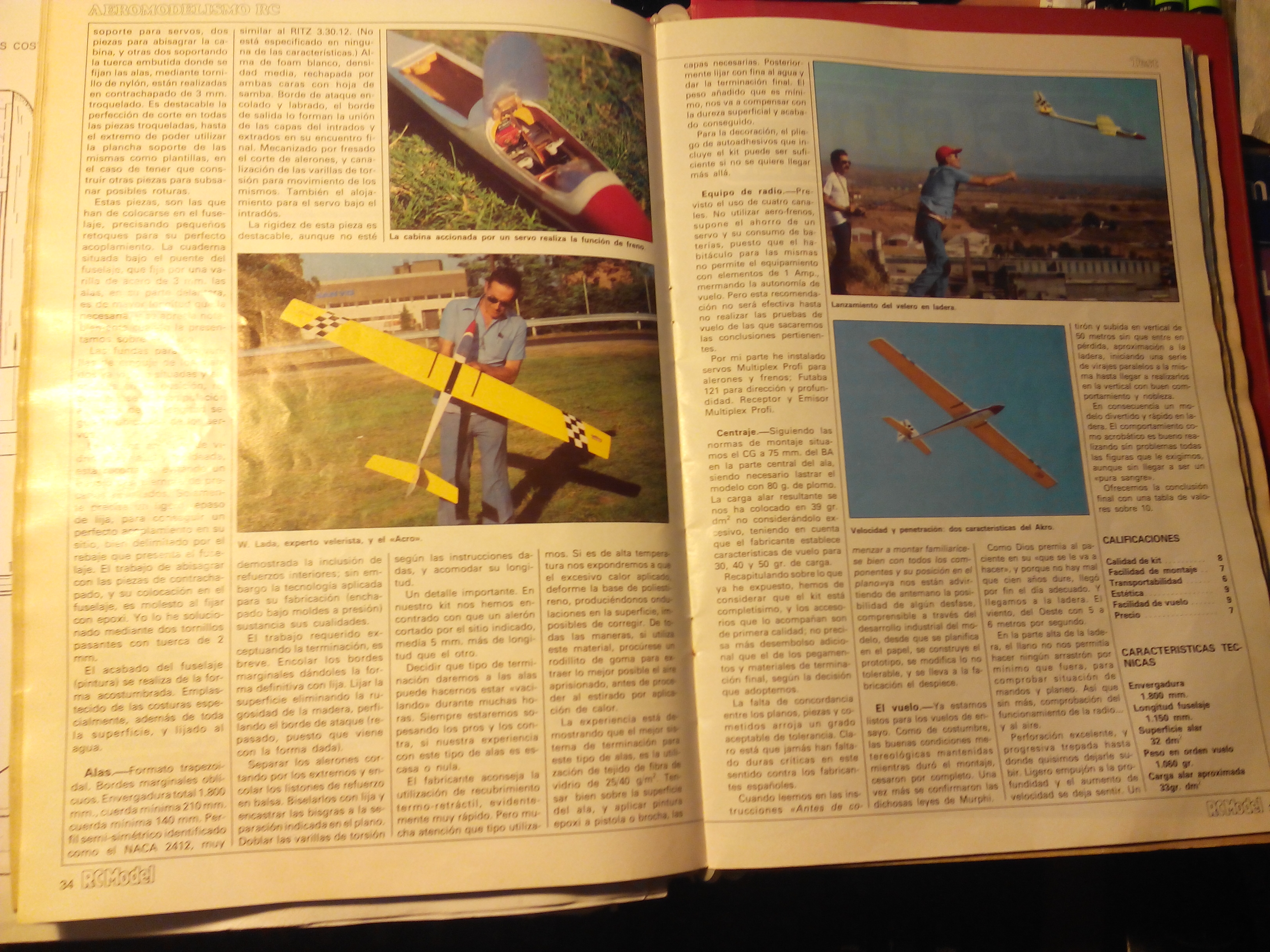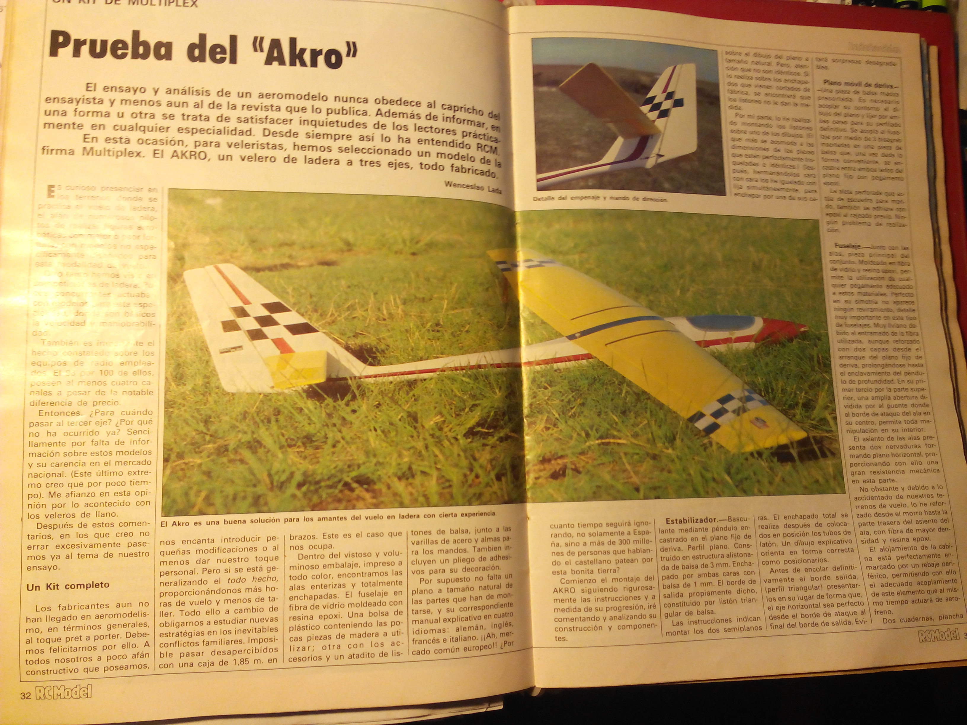 ...Tiene gracia el tema del Akro, en estos dos o tres días de indagaciones con este modelo, mi cabeza recordó que en alguna parte yo vi el Akro, y claro... caí en la cuenta de a verlo visto en La desaparecida revista de Aeromodelismo R.C Model ( la primera que salio ) a si que revisando años de revistas no me tuve que mirar muchas, en la numero 19 de Septiembre del año 82, la revista hace una prueba del Akro de la mano de del señor Wenceslao Lada, les muestro unas imágenes del articulo de la revista a continuación, :P :wink: ...una vez mas les doy las gracias a todos por tan interesante indagación sobre el modelo, como ya dije anteriormente en su momento nos pondremos con el, tambien hago caso a PA 22, para ver si se puede conseguir de alguna forma el plano y restaurarlo lo mas fiel al original, y si no, pues con lo que tenemos le hacemos una restauración y un homenaje al roquero he intrépido dueño y piloto Sukoi. :mrgreen: :lol: :wink: