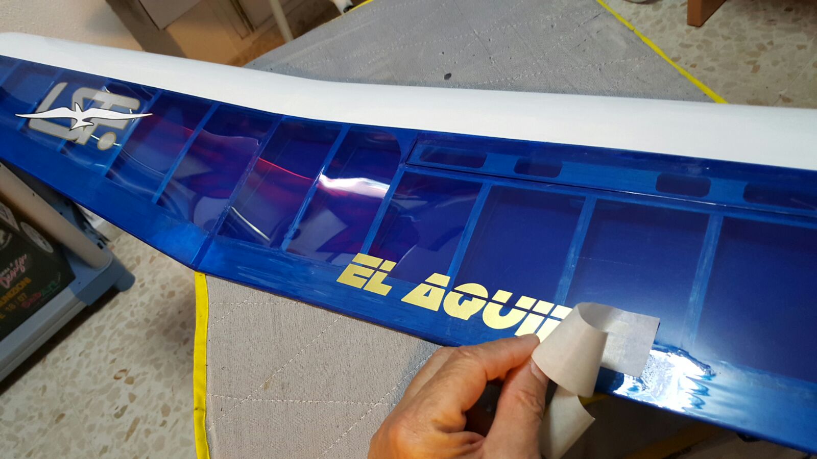 Juande... muchas veces las cosas hay que abordarlas desde otro punto de vista y con imaginación....básicamente eatú lo has dicho... en la decoración de muchos de mis modelos, la cosa se trata de dibujar, recortar y pegar.... luego vienen los matices, pero es así... en los acabados termorretractiles la decoración en mi caso queda practicamente confiada a capas de diferentes tonalidades de color del mismo plastico termorretractil; Oracover y Supermonokote y ... vinilo de plotter de corte. este último material es superligero, muy adeherente, fácil de trabajar y se pueden hacer unos gráficos decorativos muy vistosos. En el caso de nuestro Aquila como en la mayoría de los veleros, por mucho que un servidor lo intente, incluso pesando las maderas, etc. creo que hasta la fecha jamás he conseguido que ambas semialas pesen exactamente lo mismo, siempre existen diferencias... en este caso una semiala pesaba 238 gramos y la otra cuatro gramos menos como puedes observar en la fotografía, así que la más ligera es la candidata a colocar los gráficos, .... ahora ambas semialas pesan exactamente igual... :mrgreen: :) :) :)