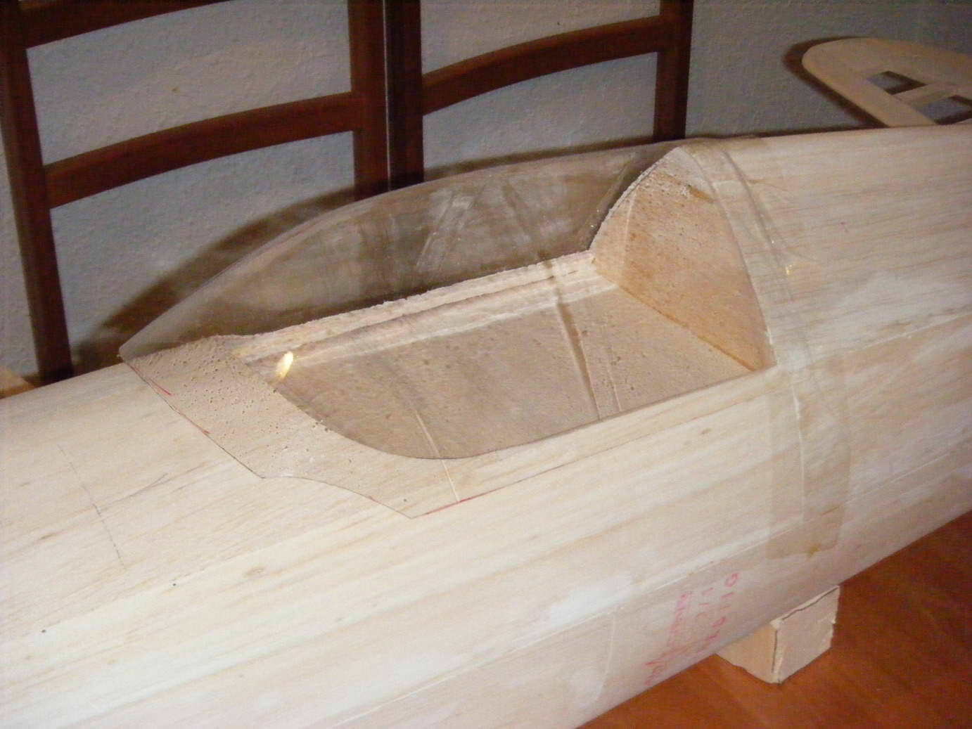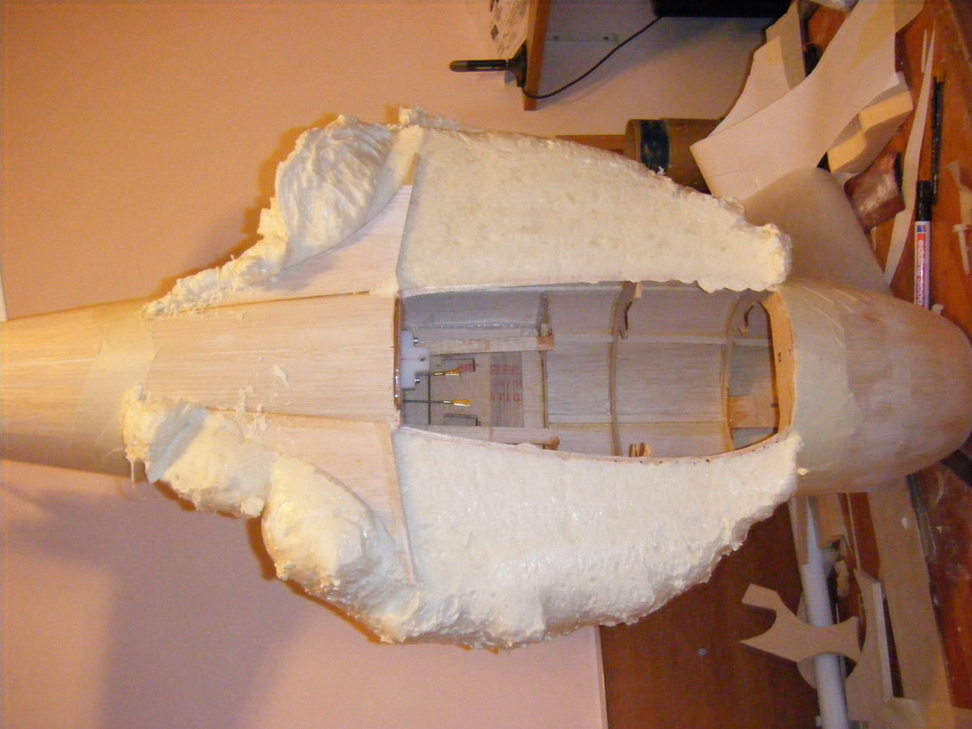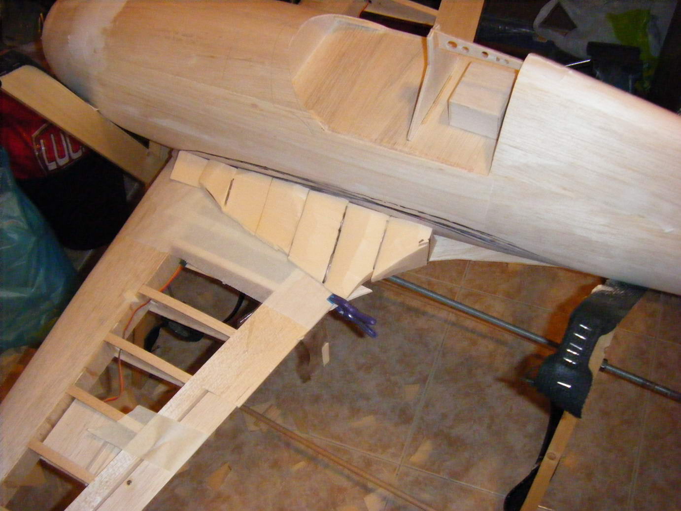 Primeramente, una de mis ideas era pegar cuñas de porex con un poco cyano o C4 a la base del karman y al fuselaje, pues eso hice.