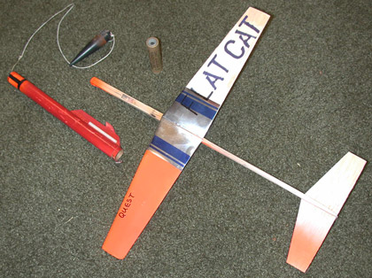 Hola, debido a mi amplia experiencia en planeadores lanzados a mano y mi última incursión en el modelismo espacial, he adquirido un kit de Quest de un planeador con propulsión con un pequeño cohete que se desprende del planeador en lo alto y baja con una banderola, por otra parte el planeador, si esta bien ajustado, debe bajar haciendo giros amplios.