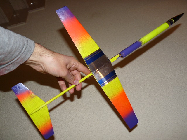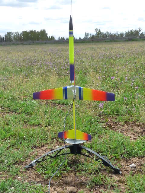 El secreto estará en que el planeador vuele bien por una parte y en segundo lugar que con el cohete montado en el planeador suba recto, aunque no importaria que escendiera en barrena ascendente, el manual en inglés, dice algo como que hay que equilibrar con peso en el cohete si el centro de gravedad del conjunto se desplaza por detrás del borde de ataque del ala.