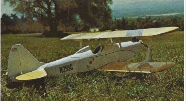 Wayfarer o Caminante, Modelo RC Sport Acro. Envergadura 52in. ( 52 pulg. / 132,1 cm ) Biplano. Motor Glow OS Max .40 Control 4 canales Diseñador Don Dewey. Compañía Svenson 1973.