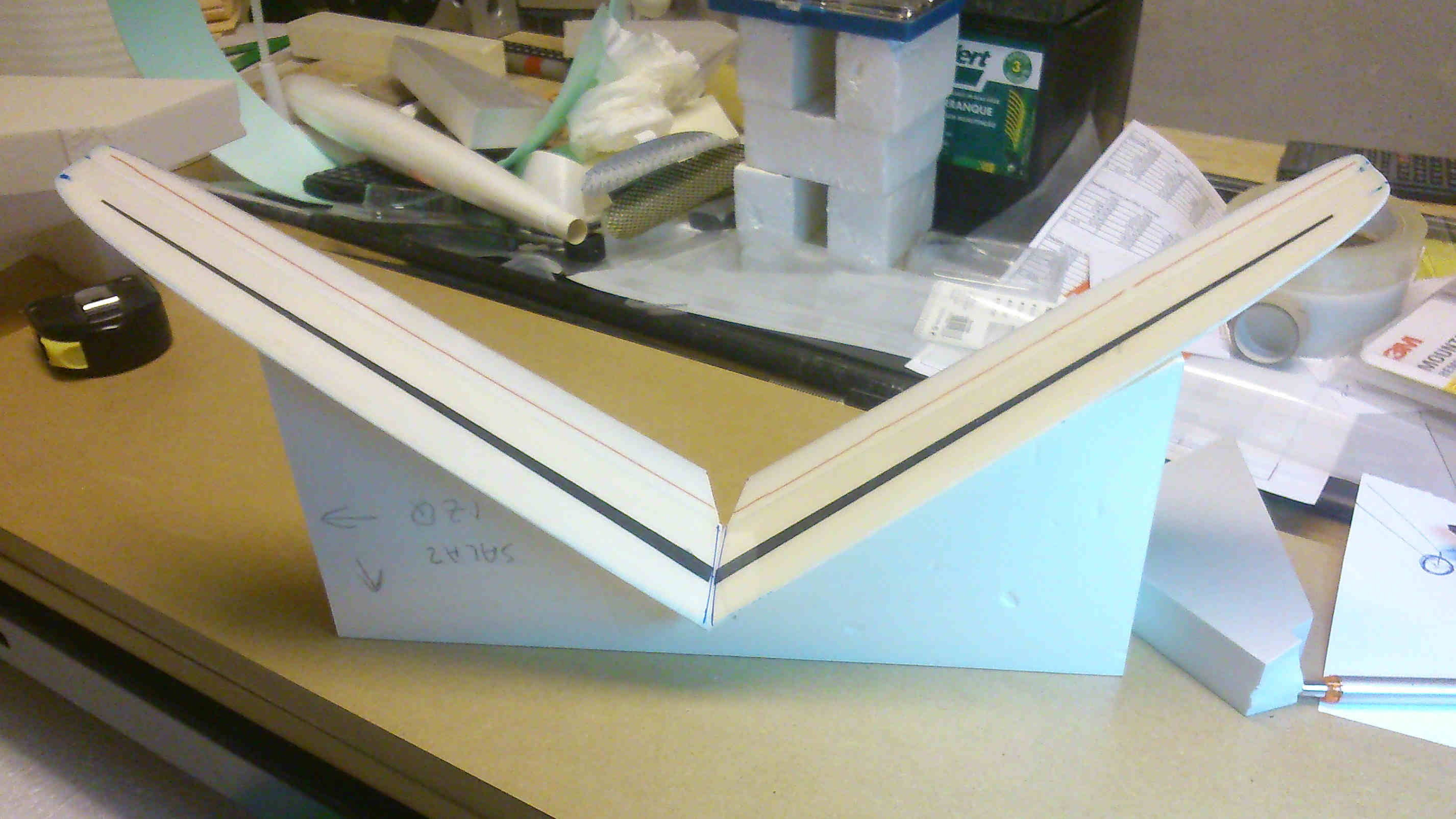Mi velero es mas sencillo, no dispongo de la tecnologia adecuada, al ser 2 tramos los enfibro por separado , luego los pego alineados en la mesa y corto alerones.