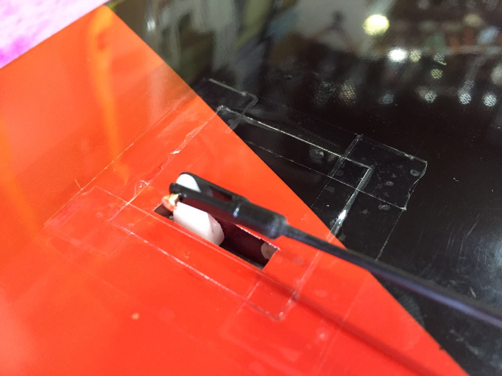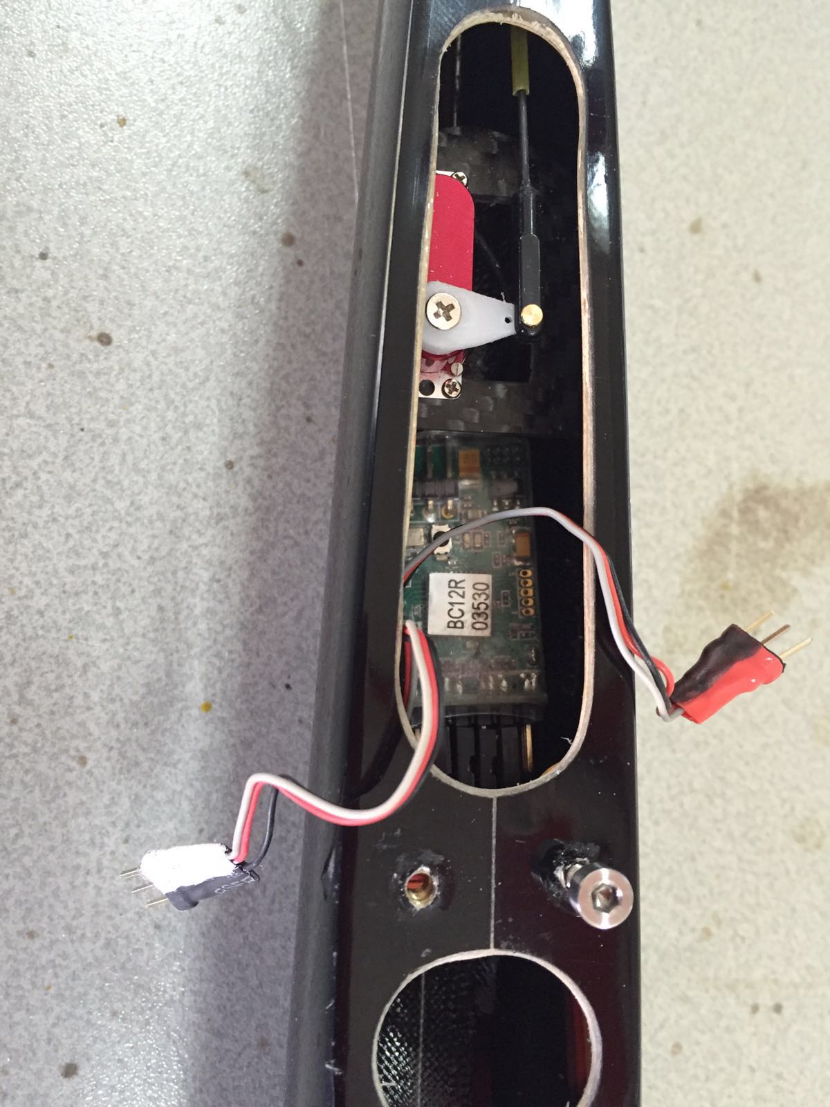 Dentro del fuse se puede ver el receptor, sin carcasa y con una simple funda termo-retráctil ... cada gramo vale por mil :D.