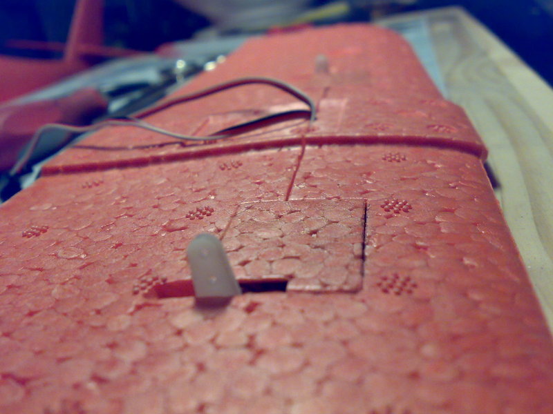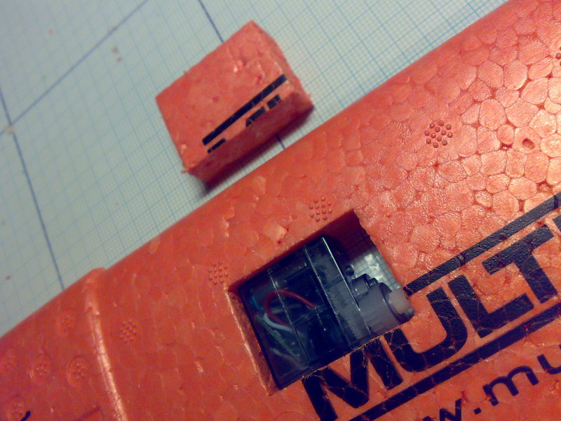 Teniendo en cuenta que sólo lleva un servo para alerones, éste se ha colocado justo cuando termina la cabina, embebido en el fuselaje (todo lo que se ha podido, ya que el planeador ha de ser desmontable y no se podía ahondar ya que traspasaba el fuselaje). Tal vez haya quedado algo alto; igual buscaré algo para recubrirlo y protegerlo de posibles golpes. Se ha recortado el horn del alerón para permitir desmontar el ala.