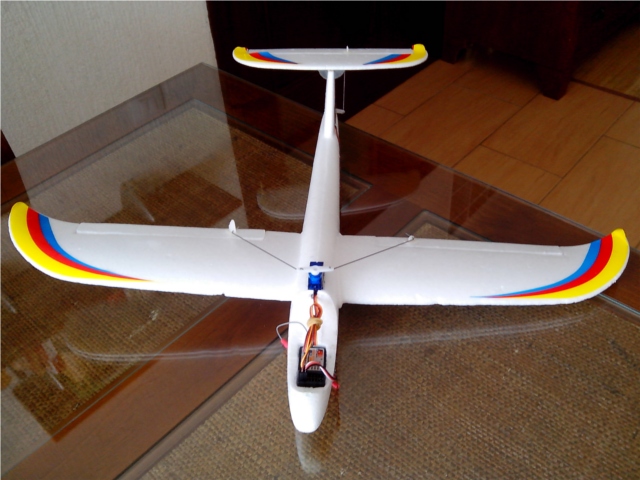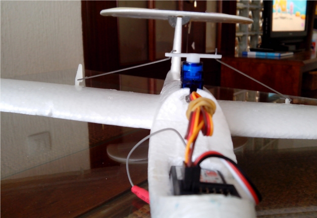El peso actual es de unos 75 gramos, pero creo que quedará sobre los 120 gramos; ya que las primeras pruebas (lanzado a mano), lastrado ha quedado en ese peso. En principio, parece que la electrónica hace su función, alabea y cabecea, pero sólo he probado a lanzarlo a mano unos 10 metros.
