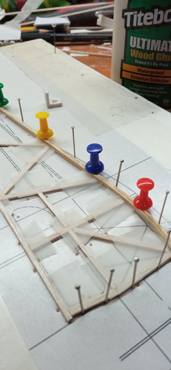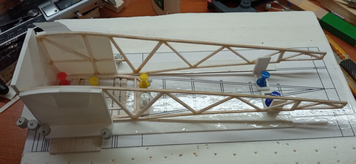Os dejo unas foticos en la que se ve como estoy ya colocando el larguero inferior de uno de los "semi-fuses" sobre el que ya estaba hecho (y lijado en plano, claro).