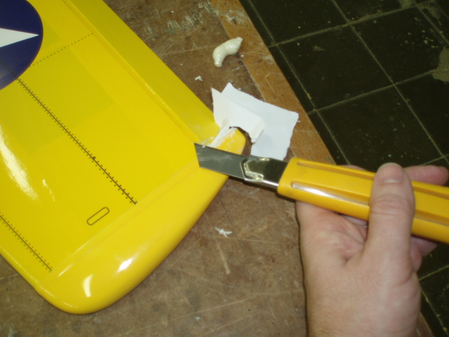 Venga que segimos un poquito, empezamos donde lo dejamos ayer, marcamos y retiramos el recubrimiento donde pegaremos la bancada del servo de alerones (con cuidadito de no cortar la balsa) al hacerlo nos damos cuenta de dos cosas; la primera es que vamos a andar un poco mal para sacar el cable de servo y por eso ampliaremos por delante un poco, la segunda, que la madera aqui es muy, muy debil asi que la reforzaremos un poco por debajo.