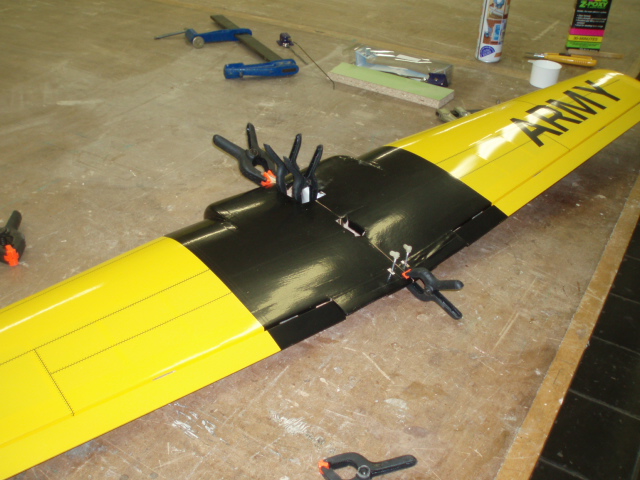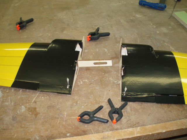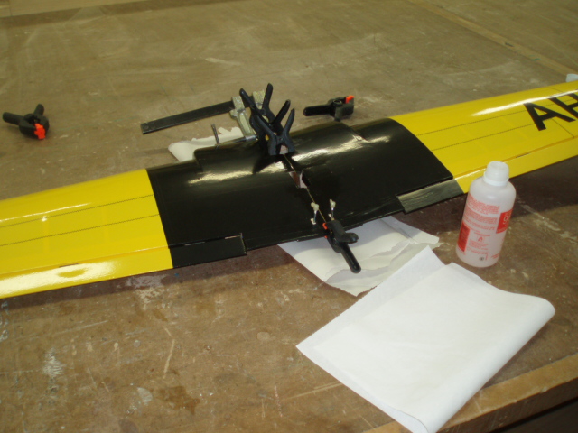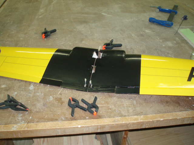 Vamos a pegar el ala, no tiene ningun misterio pero creo que esto es (junto con el empenaje trasero) a lo que mas atencion hay que prestar, lo primero que hago es hacer un premontaje, coloco todas las piezas como si ya tuvieran la cola y asi me fijo donde tengo que poner las mordazas para que todo me quede bien, lo hago ademas siguiendo la misma secuencia que hare cuando le de el epoxi.