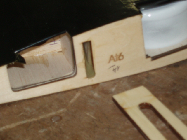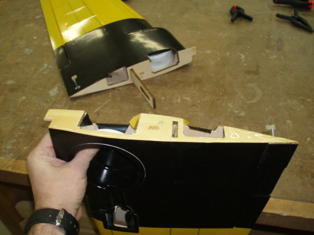 La bancada del retractil va colocada dentro del ala para que el servo quede "empotrado" en ella, ya veis que he agrandado un poco el cajeado para que ajuste bien, la bancada de alerones va pegada sobre el ala, tengo que retirar un poco el recubrimiento pero eso lo dejo para mañana.