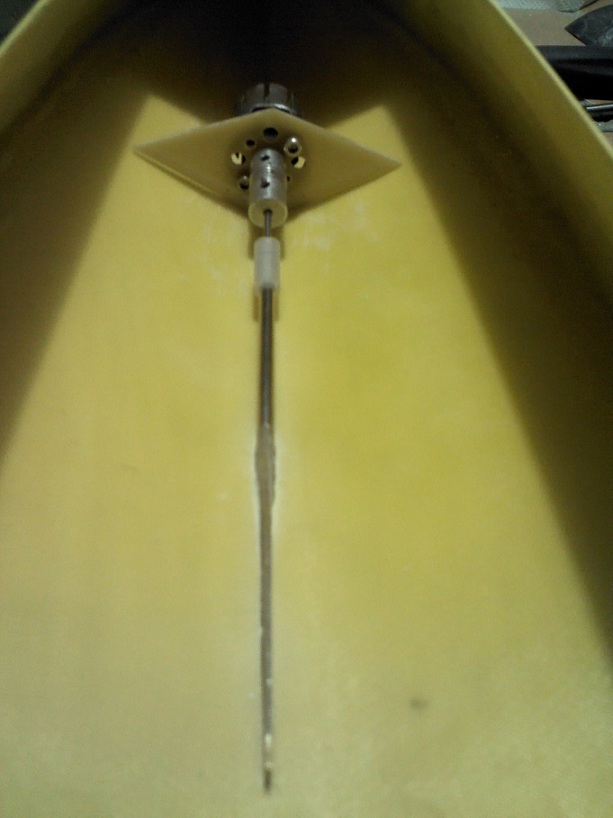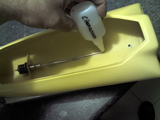 Cando lo tengo todo fijado le doy unas cuantas vueltas con el dedo a la helice y obsevo que todo el conjunto gire libre, sin movimientos oscilantes en el casquillo flotante. De tener algún pequeño desalineamiento despego todo y vuelvo a reajustarlo hasta que me quede bien. Al fin y al cavo son solo unas gotas de ciano que saltan con un poco de presión. Merece la pena hecharle tiempo y mimo a esta parte del montaje ya que se trata de la propulsión de nuestra lancha.