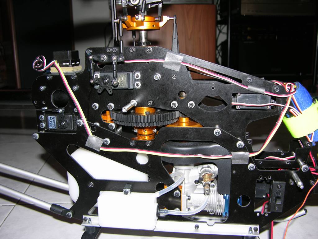 Aqui os dejo la parte final de construccion del helicoptero. Fijaros bien en que el helicopero esta montado con servos normales 3001. Lo he probado con ellos y funciona correctamente, ya que este helicoptero esta pensado, tanto para gente experta como para iniciados en el hobby. Un detalle importante en mis montajes es que siempre uso doble bateria con doble interruptor en todos mis helicopteros, lo cual podeis ver en las fotos adjuntas. Las baterias para mayor proteccion, del circuito electrico,estan protegidas por diodos. Las razones para poner dos baterias son muchas, pero os puedo asegurar que desde que uso ese sistema ya no he tenido las mal llamadas "interferenciasss". Ademas si cuando la cargas, ves que una carga exageradamente mas que la otra, te das cuenta de que algo va mal.