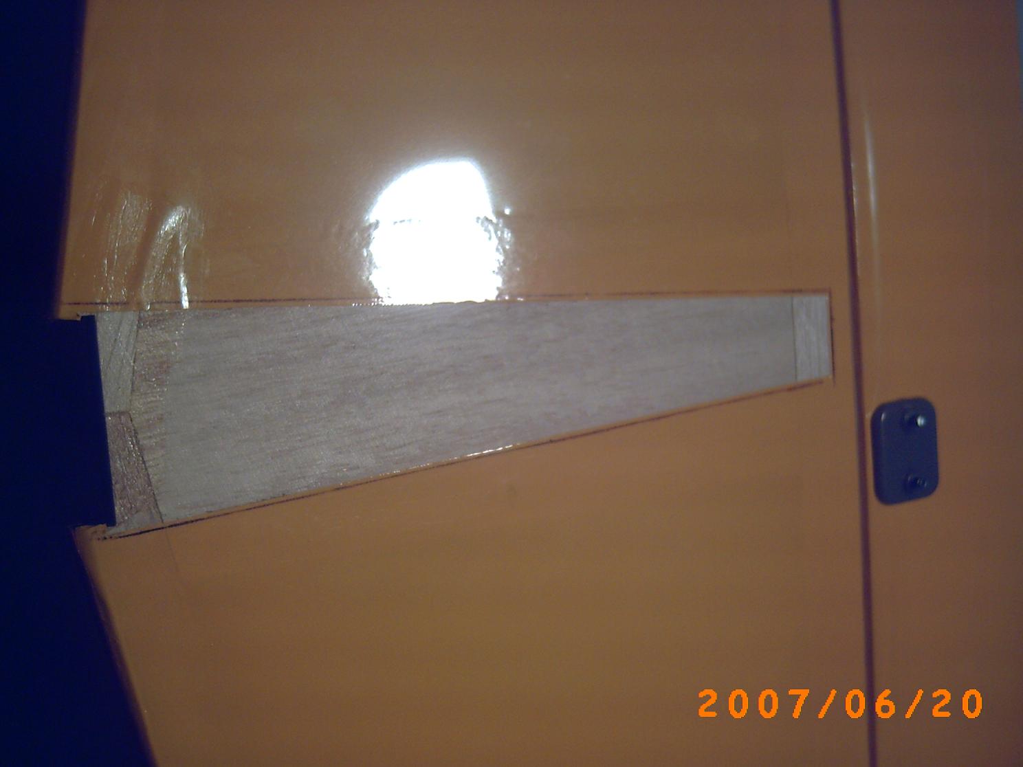 Si habeis buscado un poco por el foro, algunos compañeros del foro tienen problemas con el servo de alerones, que toca con el servo del gas al montar el ala en el fuse. Como apreciais en las fotos, como queda hueco debajo del servo, hasta el cajillo del servo, yo le he rebajado un poco, la madera sobre la que atornillar el servo. Algo de separacion ganaremos. :) .