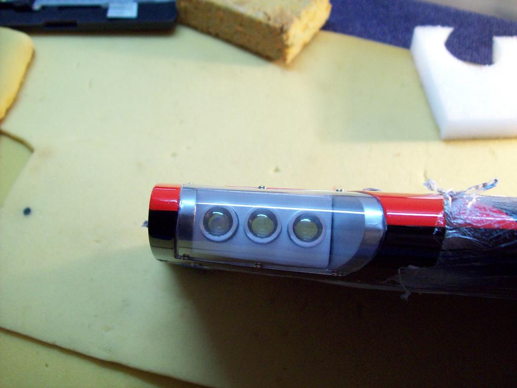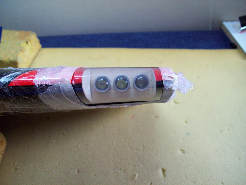 El soporte donde van sujetas las luces es de madera de balsa, se puede hacer de cualquier otro material pero he preferido hacerlos en balsa por esto del peso, seguidamente le he dado una imprimación de laca para endurecer la parte externa de la balsa y para que la madera no absorba la pintura, una vez seco, he procedido a pintarlo con spray de aluminio y ha quedado bastante bien, vamos eso creo.