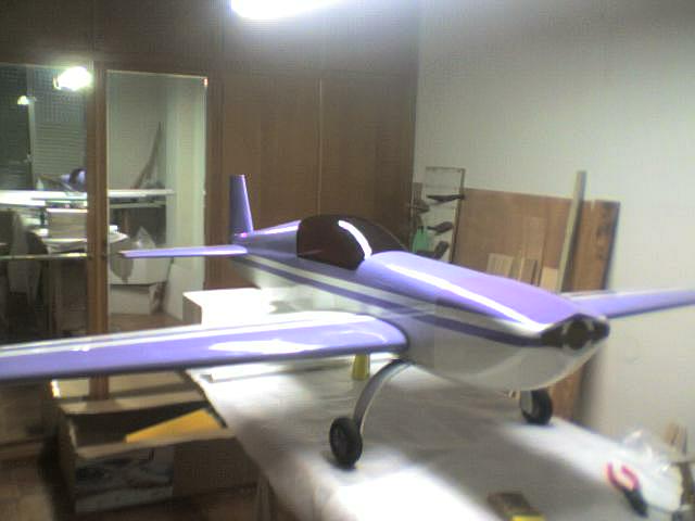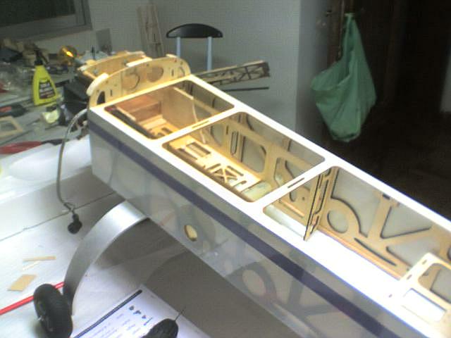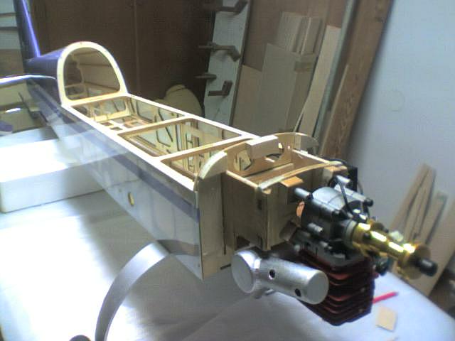 el avión tiene 1.900 mm. de env. pesa muy poco no llega a los cuatro kilos y tiene el "cajón" delante para el motor que ya he tenido que recortar y hacer un escote para que el tubo de escape de este motor gasolina quepa, pues sin el escote el motor como tiene el escape posterior estaría demasiado delantero. la estructura está aligerada al maximo la parte inferior del fuselaje son cuatro largueros de balsa y monocote, nada mas los laterales son contrachapado super aligerado , la tapade la cabina es "todo balsa" menos dos minicuadernas, en fin, que lo veo muy ligero, y mi pregunta es si alguien lo tiene con un motor gasolina que tipo de refuerzo le ha hecho(Si le hace falta)