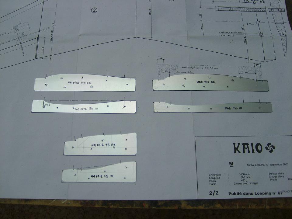 Las plantillas de los perfiles son dobles.Las una para cortar el intrados y las otras para el extrados.Evidentemente hay otras formas de corte pero yo he preferido respetar en todo momento las instrucciones del plano.(Caprichos de uno)Estan hechas en aluminio de 0.25mm.Observad la plantilla marginal (Naca0012 de 75mm) abajo a la izquierda que será la que nos provoque en el ala una torsión positiva de 3º