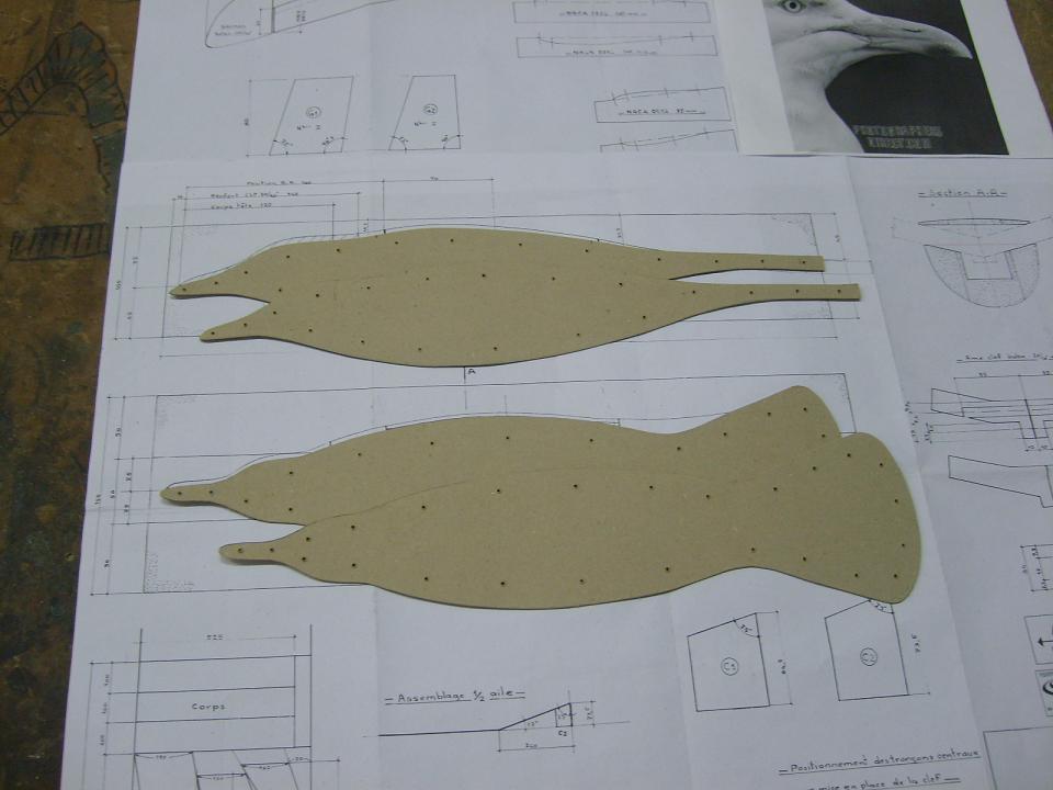 En esta primero foto se observa los seis bloques en bruto ya cortados que forman la estructura de las alas y los tres del fuselaje.Sobre ellos,las plantillas de corte de los perfiles alares (RGB8, y Naca 0012) y los perfiles dobles del fuselaje en alzado y en planta.(La fotito de la gaviota no es del plano y será usada más adelante para los detalles del pico)