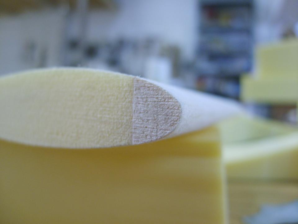LLegado a este punto, el siguiente paso sería "limpiar" los corte.Eso significa que hemos cortado los perfiles con una "demasia" tanto en la fuga como en el ataque y ahora es necesaria ajustarnos a la medida final de la cuerda en todas las secciones del ala y comenzar a montar los bordes de ataque como se muestra en la siguientes fotos.