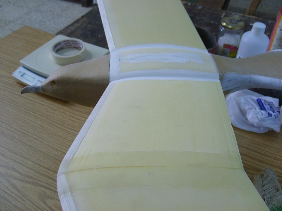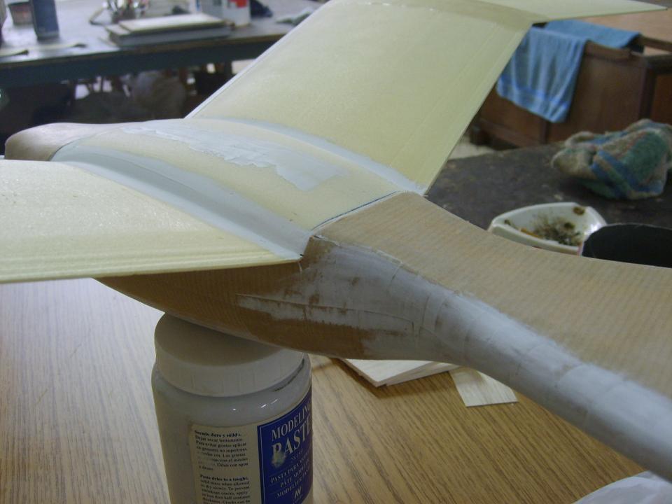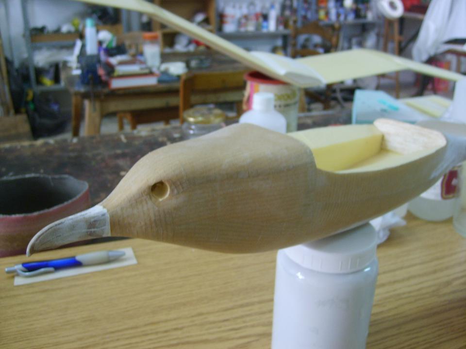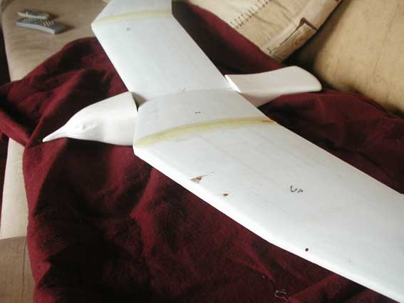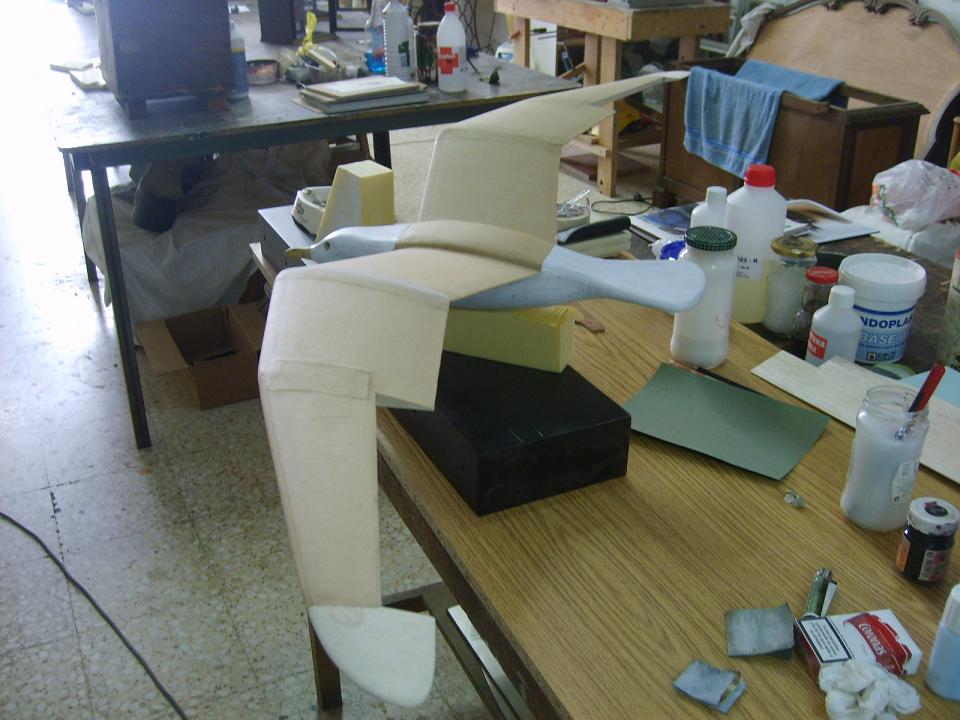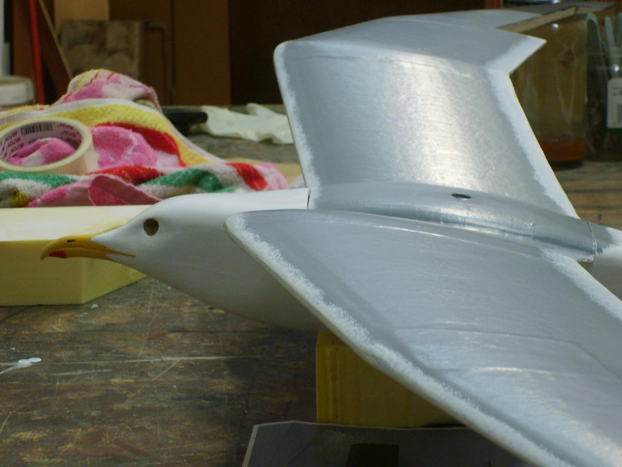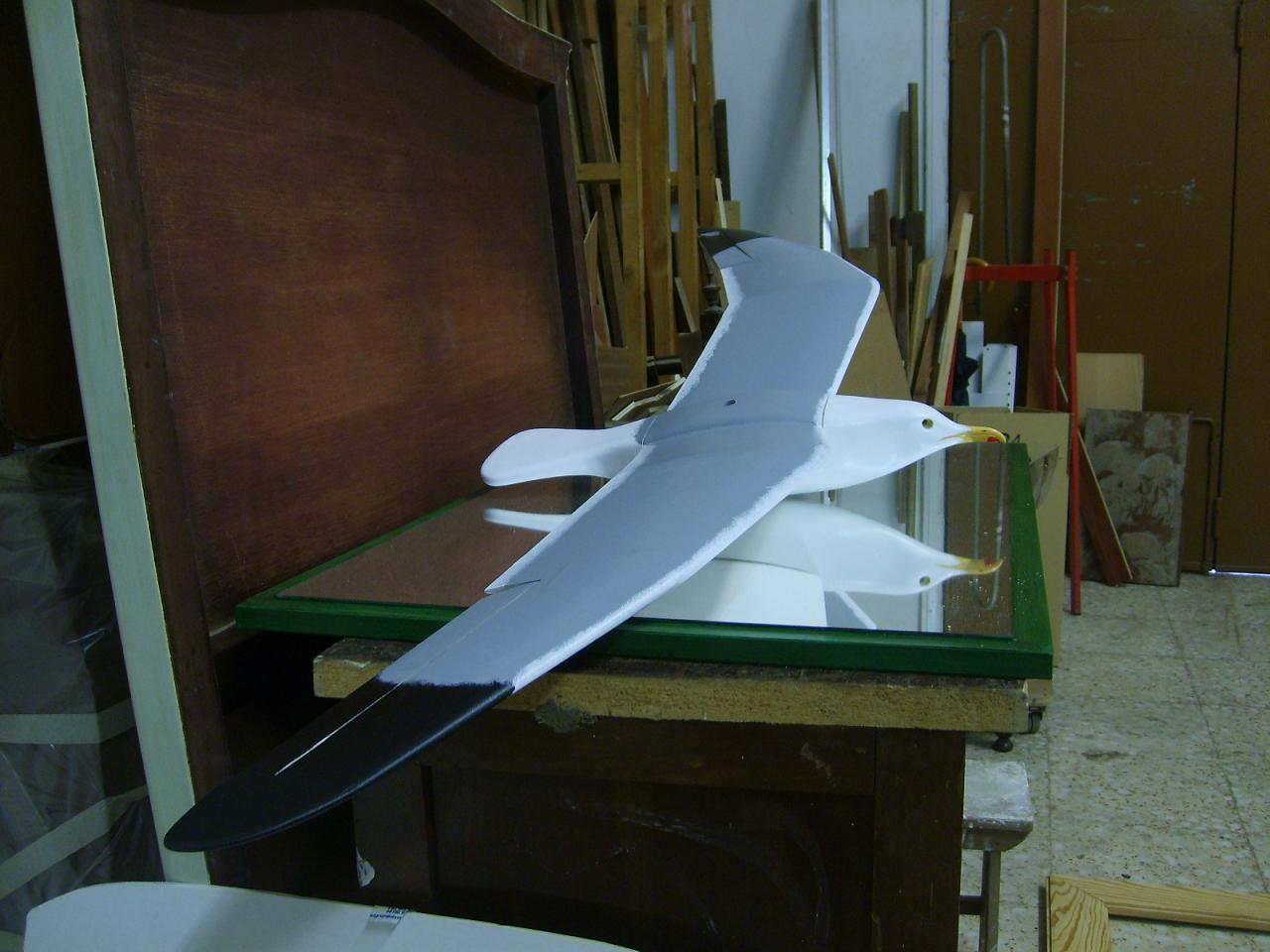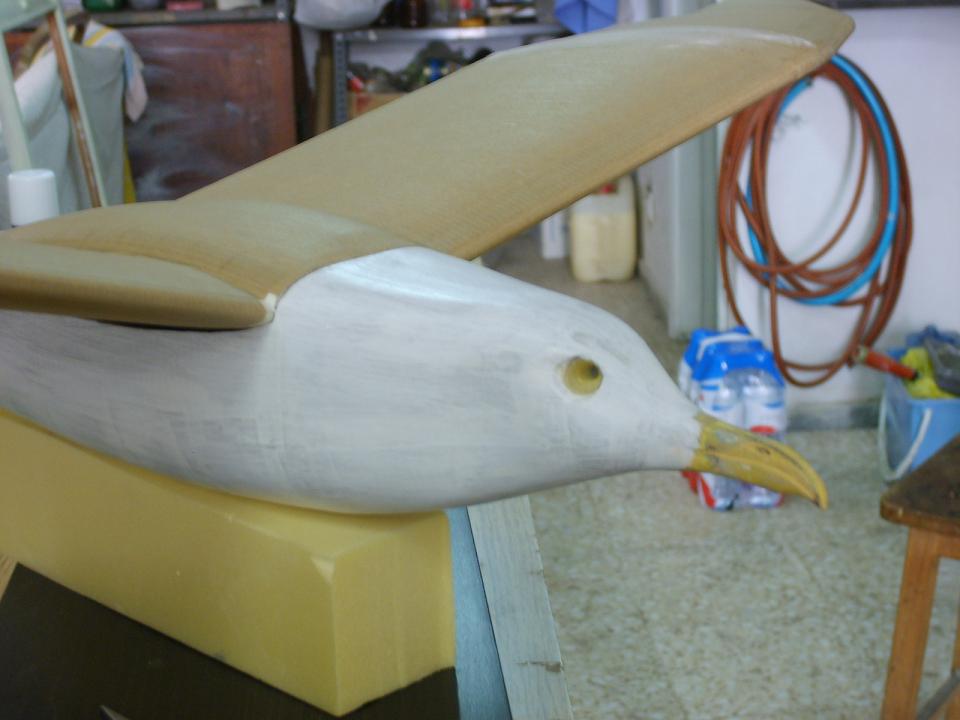 Bueno, nuestra gaviota ya está entelada con papel kraft,trabajito algo pesadillo pero que nos proporciona una buena resistencia y poco peso.A partir de este momento,a pintar se ha dicho.Pintura al agua,fácil,limpio y sencillo (parezco el de bricomania)y sin preocuparse en exceso por el acabado,es más si le podemos sacar rayas a nuestro pincel,mejor, así simularemos la textura de plumaje del fuselaje.
