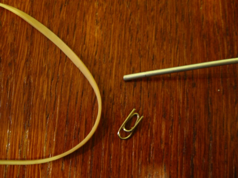 Descartado. Me remito a las imágenes anteriores. La pajita reparte mejor el esfuerzo en una mayor longitud de tubo. Además, mantiene la goma centrada en el fuselaje; para ello la longitud de la pajita ha de ser justo algo menor que la anchura del fuselaje en la zona de enganche. Por ejemplo, para el Cougar (fuselaje ancho) la pajita tiene una longitud de unos 1,6 mm, en cambio para el Rundum (mucho más estrecho) la pajita medirá sólo 0,8 mm.