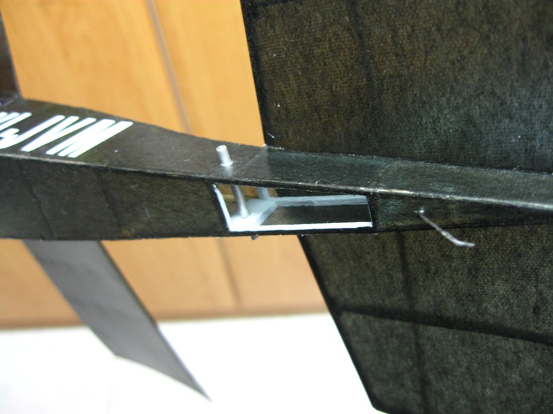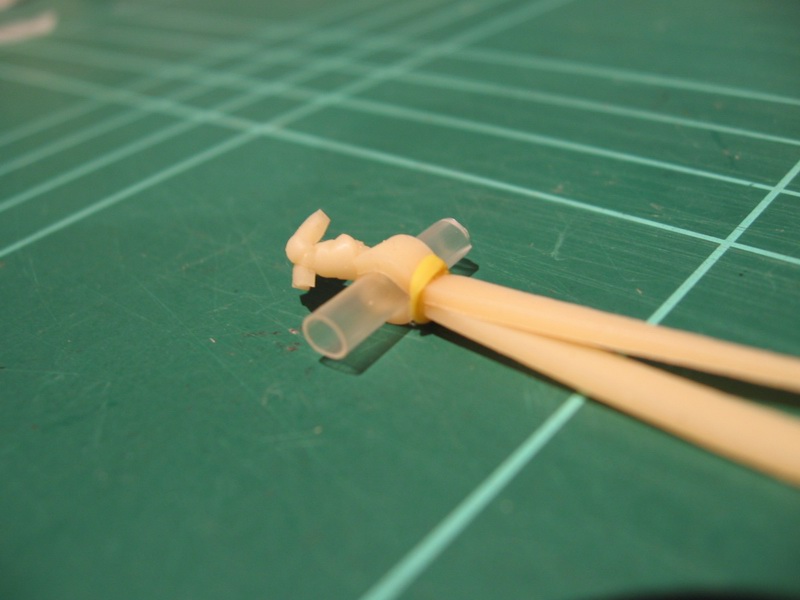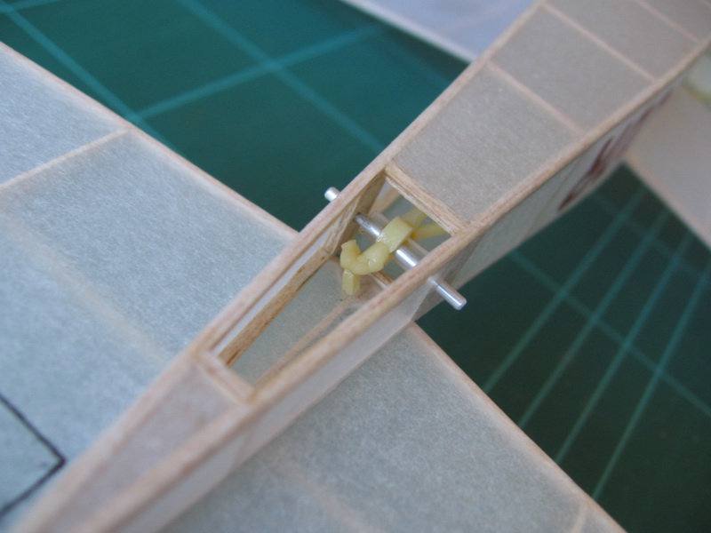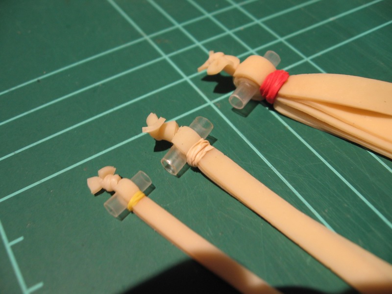 Al final, como no he encontrado en mi pueblo arillos de goma lo suficientemente pequeños he usado el sistema de S-invertida para el morro, sin nada más. Para el enganche de cola he puesto una pajita, tal como recomendaba el MAESTRO.