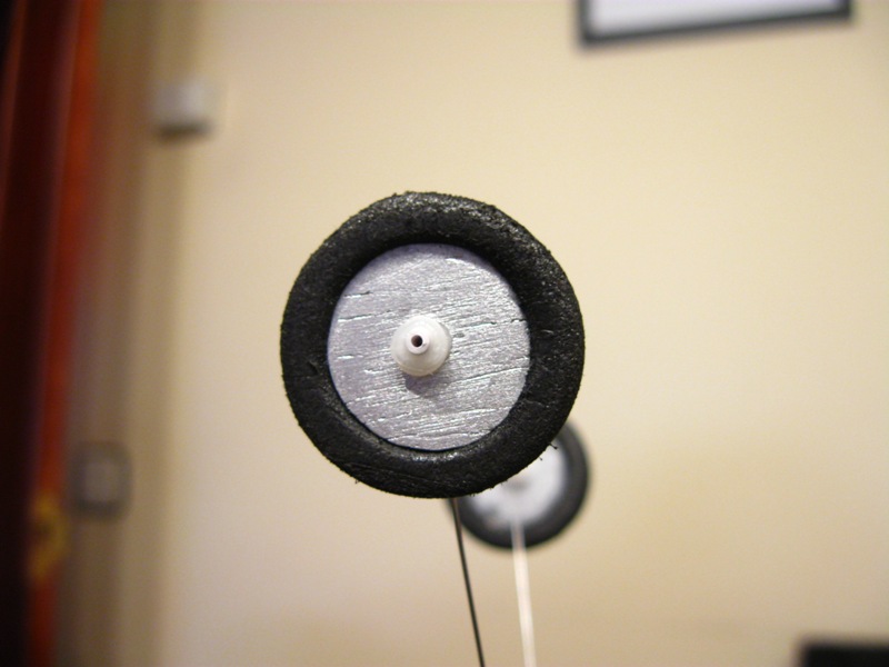 Los ruedas las he hecho al estilo de Hinomaru: núcleo de chapado de balsa de 2 mm y neumático hecho con una aro de poliestireno expandido negro (lijadito para redondear los cantos y pegado con ciano adecuado a este material). Total: 0,5 gr el par.