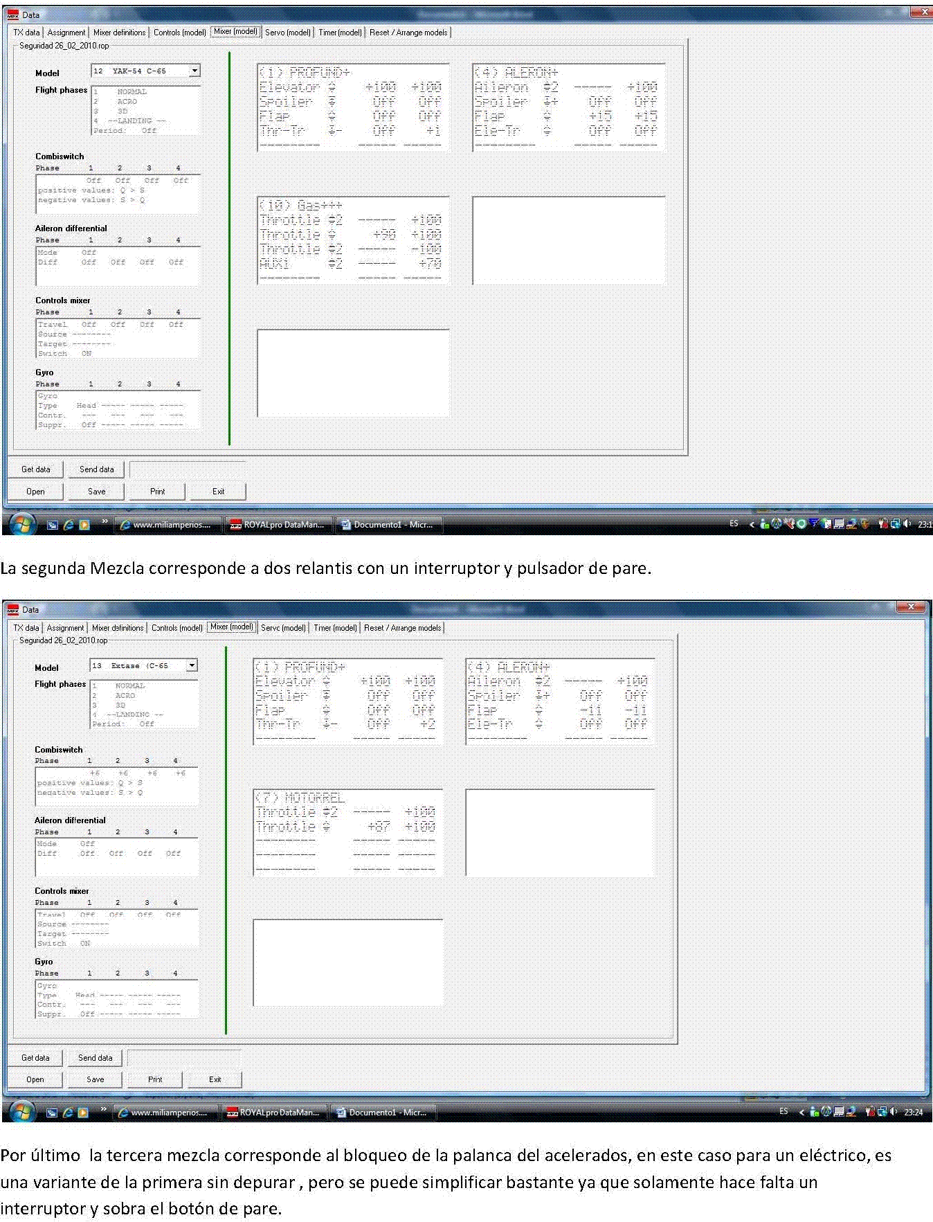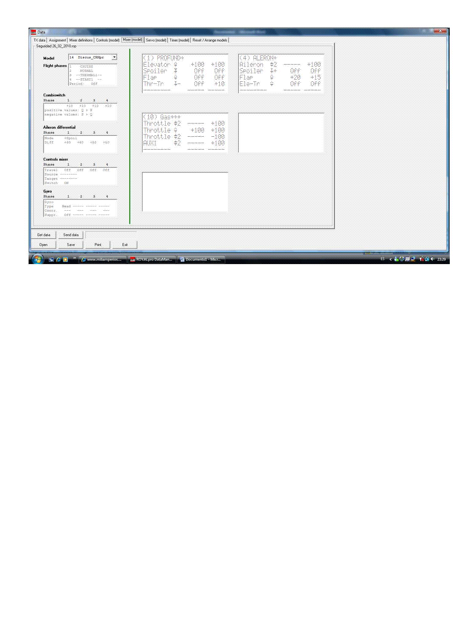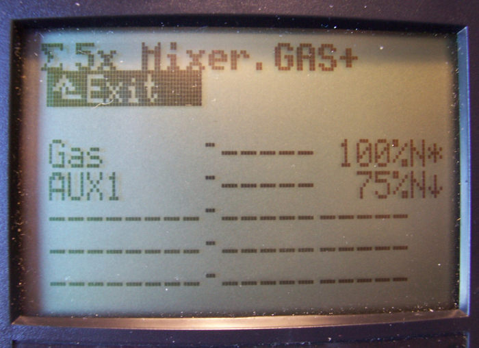 5. - Bueno, ya hemos definido la mezcla, y preparado todo el sistema. Ahora sólo queda acceder al menú Mixer->GAS+ e indicar los desplazamientos del mando del GAS, y el % de la posición del gas cuando está inhabilitado. En mi caso, el 100% para el gas, y el 75% para el ralentí.
